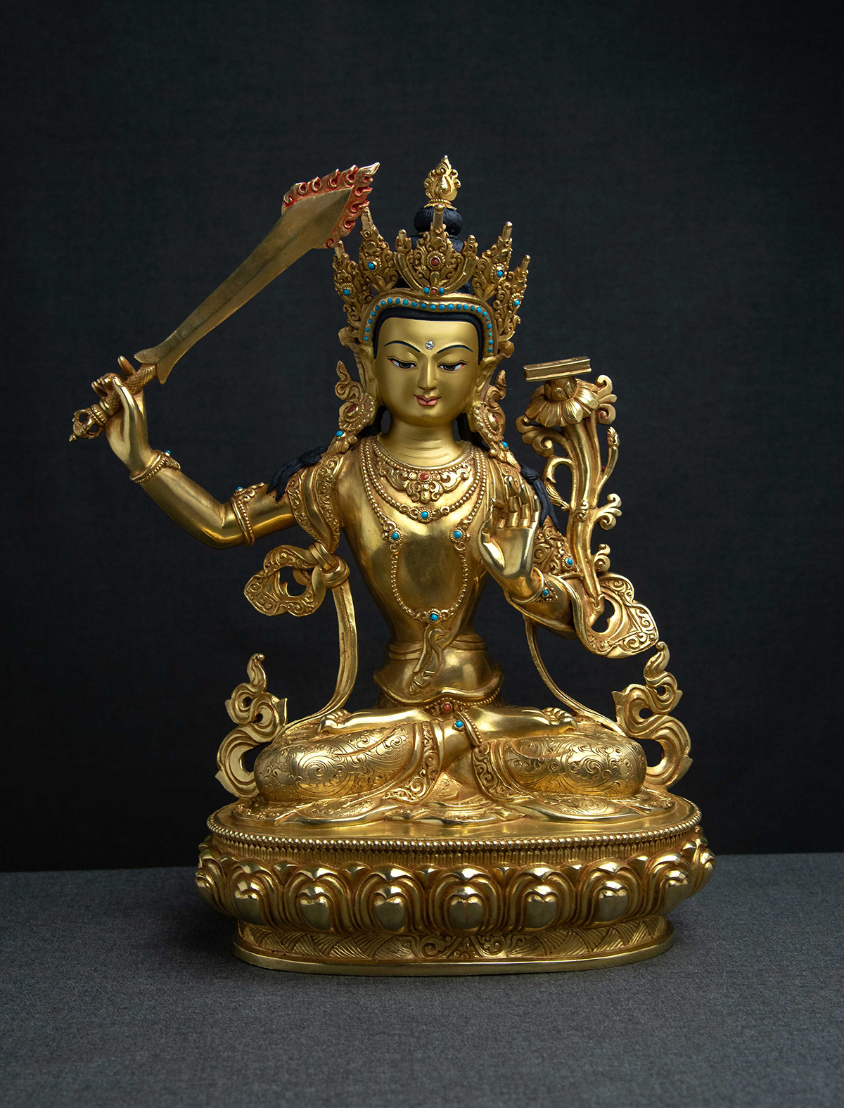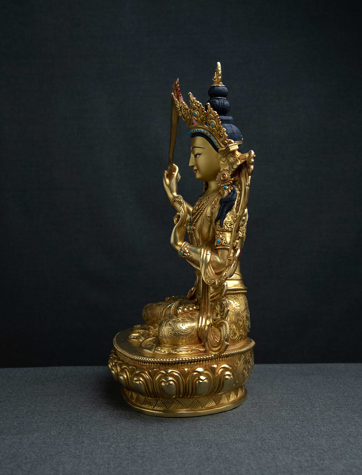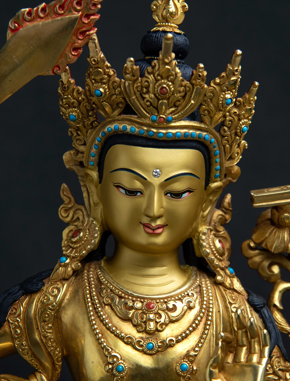 Holding a flaming sword to dispel the darkness, Manjushri is a Bodhisattva who embodies wisdom. His appearance and qualities have inspired our team of artists and craftsmen to create this exquisite statue with great attention to detail and craftsmanship. The engravings have been carved with high-depth, allowing for clear visibility of this beautiful structure. The statue has been entirely mercury gilded with 24k gold, and an antique finish has been applied to give it a radiant appearance. The face of the statue has been meticulously painted with detailed features, exuding an aura that can evoke a powerful experience for practitioners and viewers alike.