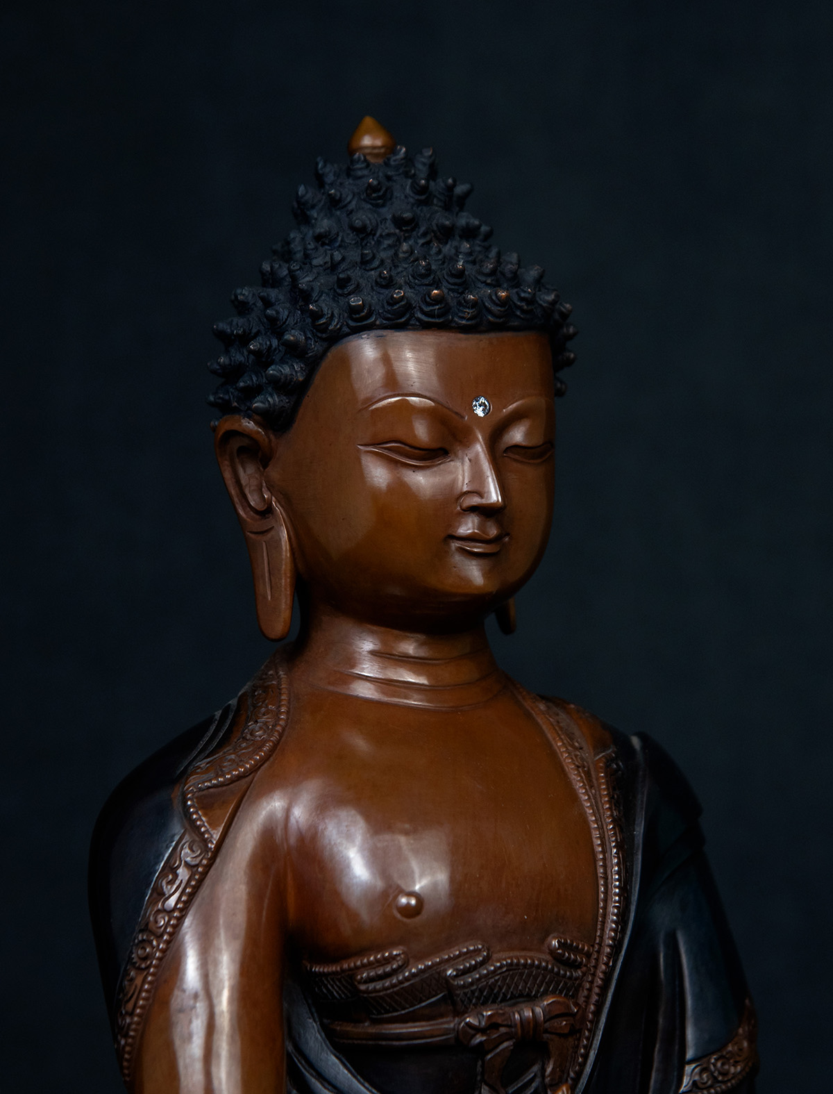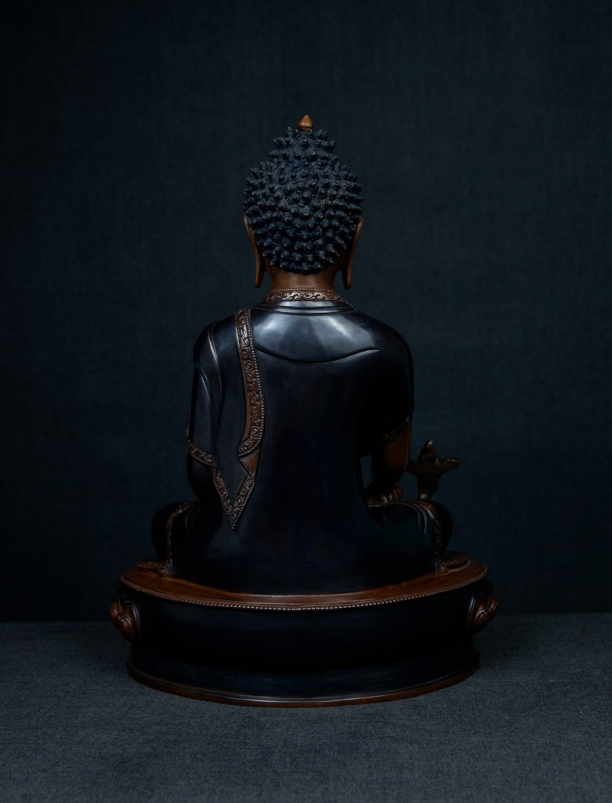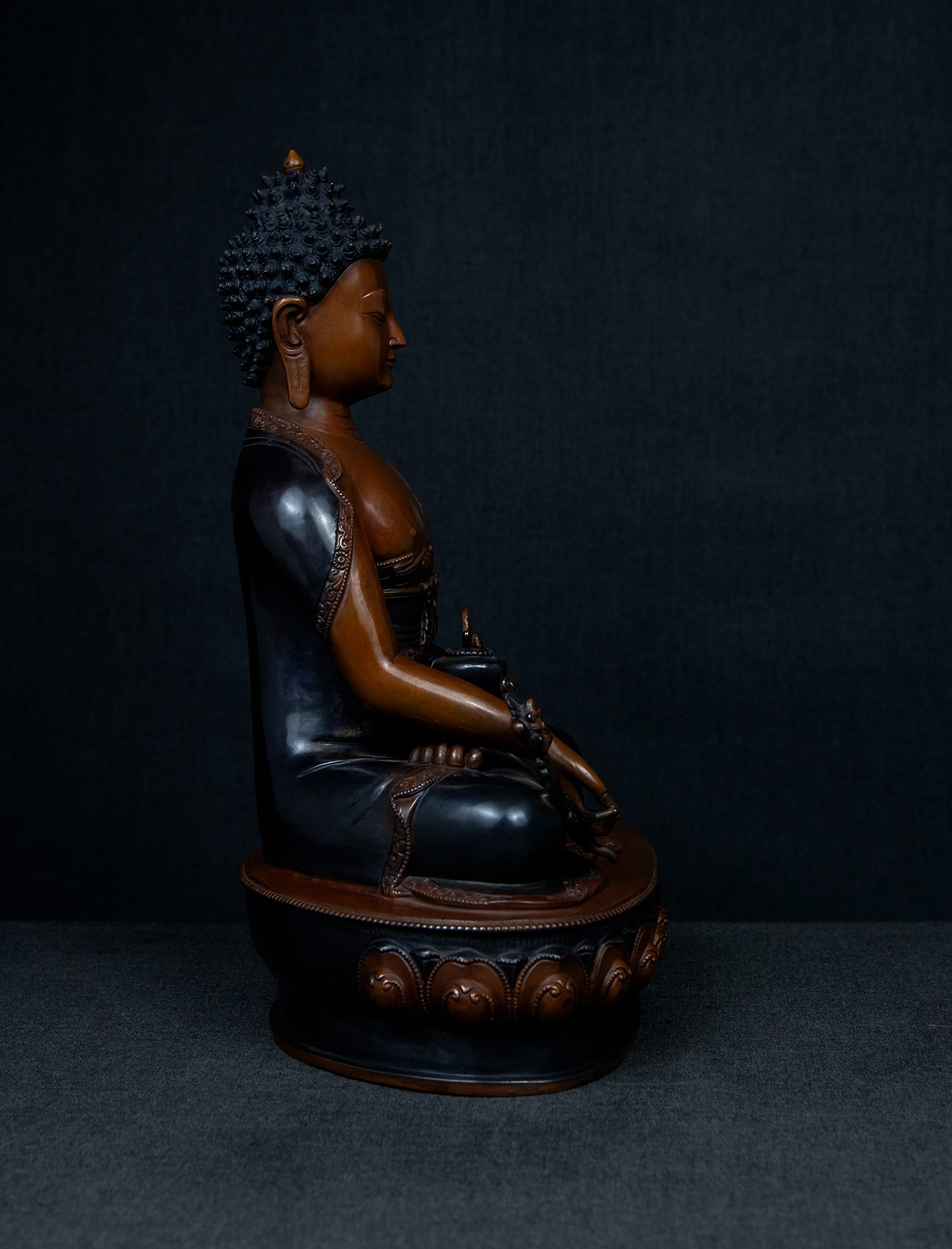 Crafted with devotion and precision, this statue of Medicine Buddha (Bhaiṣajyaguru) embodies serenity that promotes practitioners and viewers to engage in his radiant embrace. The enlightened figure is rendered in serene repose, his left hand cradling a jar of medicinal nectar—symbolizing the alleviation of physical and spiritual afflictions—while his right rests in the gesture of granting blessings. Flowing robes, etched with intricate swirling motifs, cascade in harmonious folds, their delicate carvings reflecting the boundless reach of compassion. Lustrous copper plating enriches the statue’s presence, while a two-toned antique finish in deep charcoal and earthy bronze evokes a timeless connection to ancient wisdom.