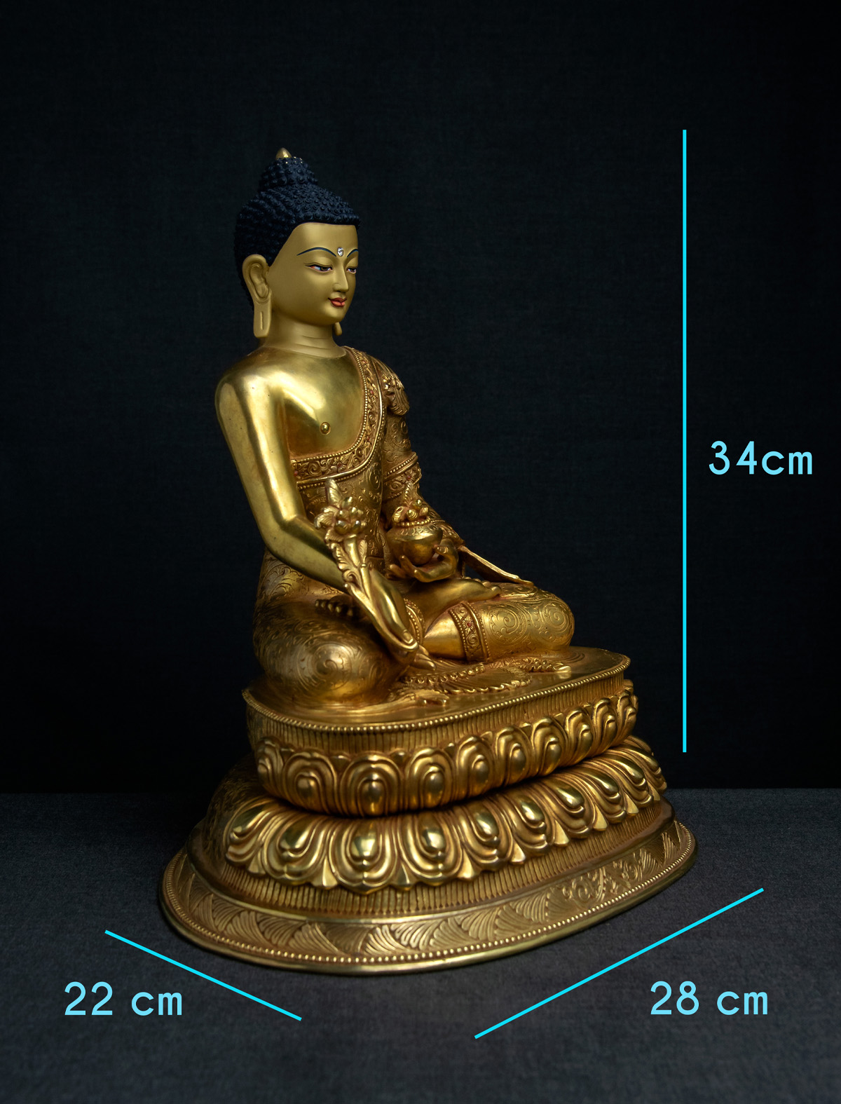 Medicine Buddha is a revered figure for practitioners of Buddha Dharma conducting healing practices. This exquisitely crafted statue of him showcases the finest artistry and craftsmanship that we have to offer. Seated on a double-lotus throne, the intricate engravings on his robe have been painstakingly detailed to perfection, highlighting the Buddha's serene and compassionate nature. The statue has been coated entirely with 24k gold, which, together with the antique finish, gives it a timeless appeal.