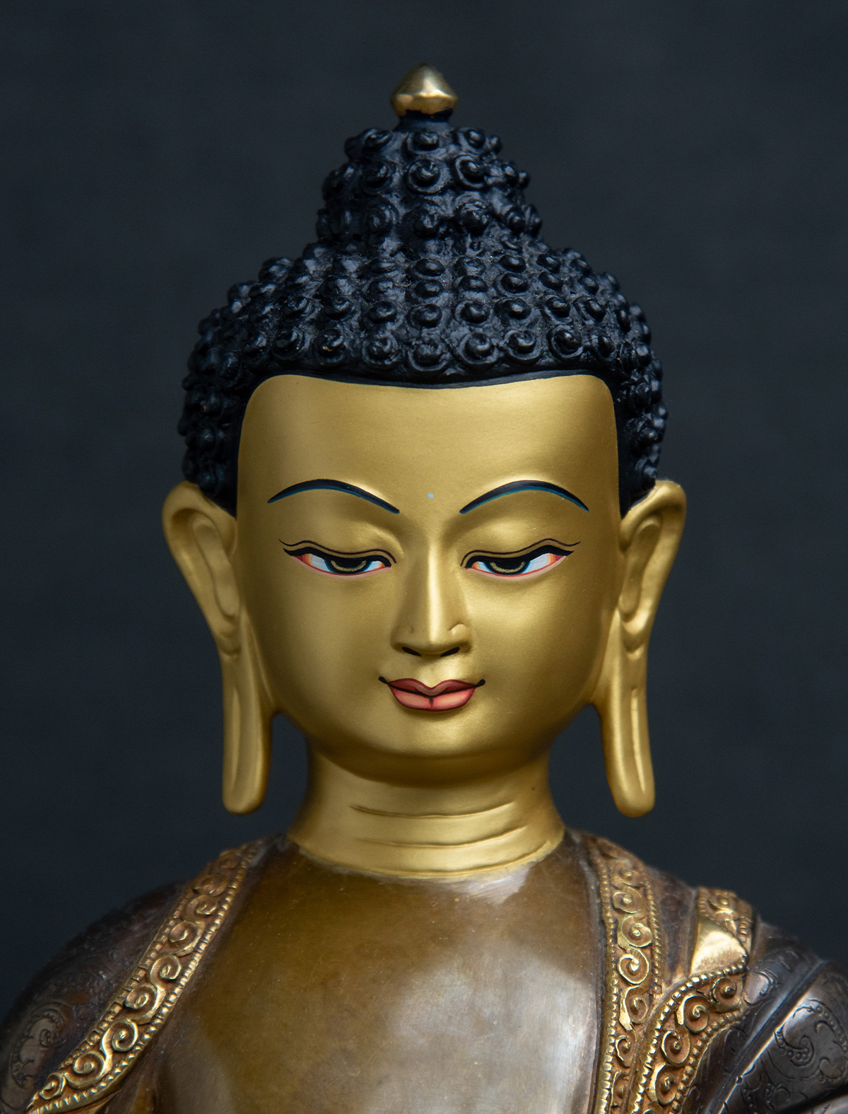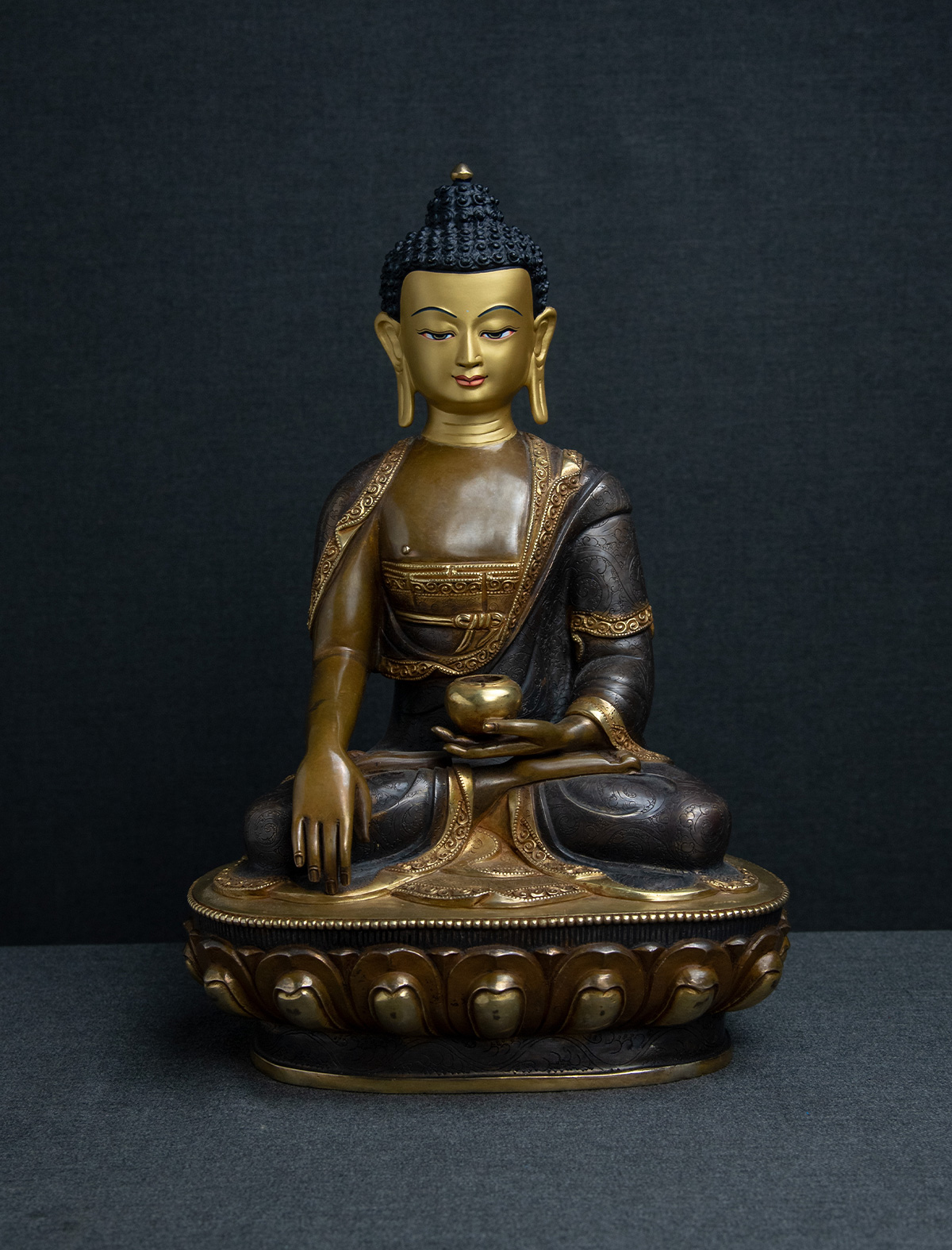 This magnificent statue of Shakyamuni Buddha is a tribute to the revered spiritual leader and holds a special place in the hearts of all practitioners of Buddha Dharma. The expert craftsmanship is evident in the clean and smooth lines and the beautiful engravings that adorn his robes. The statue has been partly gilded with 24k gold, adding to its splendor. The two-toned antique finish creates a stunning effect, with a brownish hue on his bare skin areas and a blackish finish on his robe, adding depth and character to the piece. The face has been carved with precision and the highest skill, using gold to capture the serene and peaceful expression of Buddha. This statue is a testament to the artistry and devotion of its creators and a remarkable embodiment of the teachings and wisdom of Shakyamuni Buddha.