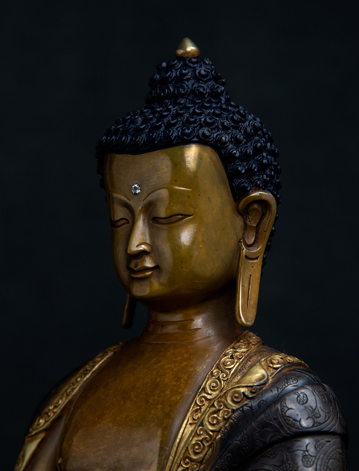 This magnificent statue of Shakyamuni Buddha is a tribute to the revered spiritual leader and holds a special place in the hearts of all practitioners of Buddha Dharma. The expert craftsmanship is evident in the clean and smooth lines and the beautiful engravings that adorn his robes. The statue has been partly gilded with 24k gold, adding to its splendor. The two-toned antique finish creates a stunning effect, with a brownish hue on his bare skin areas and a blackish finish on his robe, adding depth and character to the piece. The face has been carved with precision, bringing out the serene and peaceful expression of Buddha. This statue is a testament to the artistry and devotion of its creators and a remarkable embodiment of the teachings and wisdom of Shakyamuni Buddha.