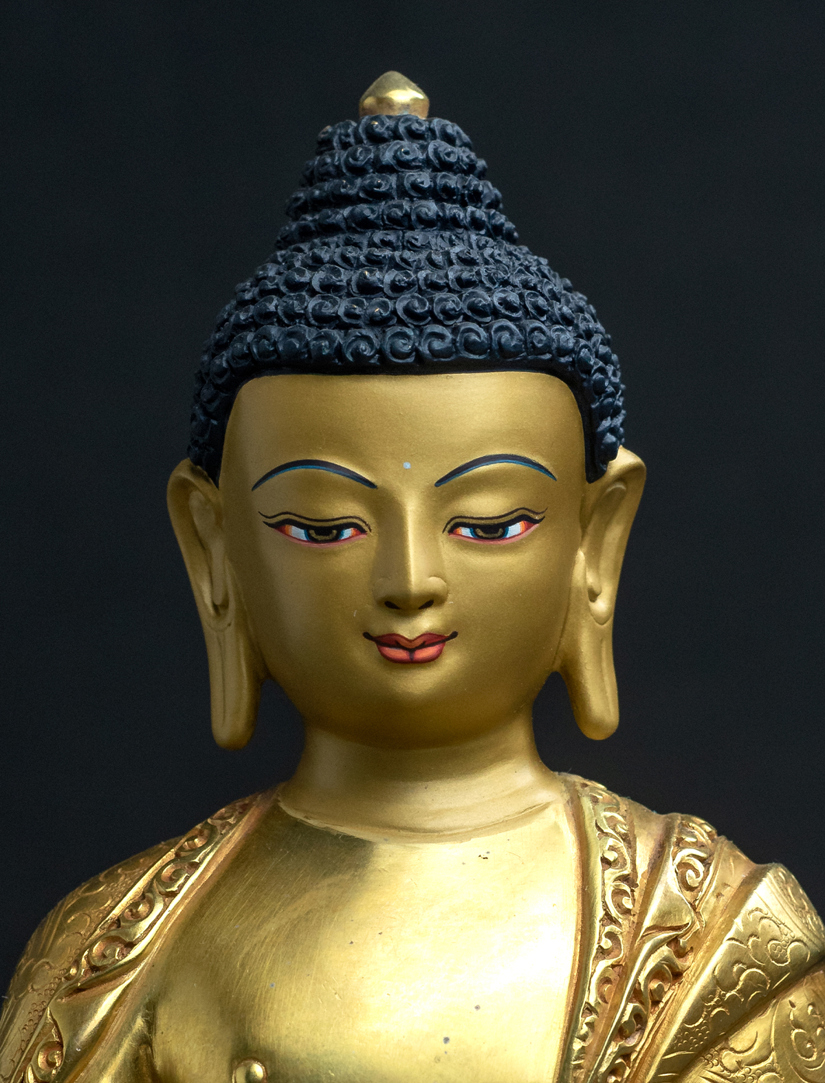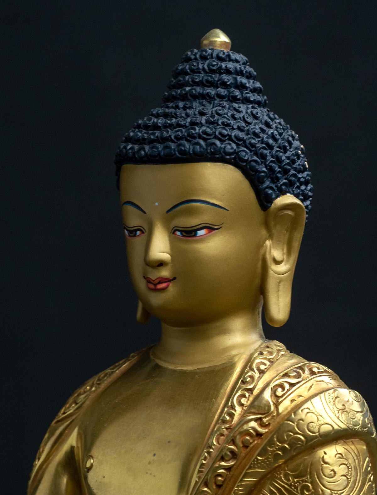 Shakyamuni Buddha is known to be the founder of Buddhism and hence it could be said as being the most popular figure amongst the practitioners. Crafted with high-level detailing that we see on his robes, this statue could certainly fit perfectly in a shrine. 24k gold has been gilded entirely on the statue. Antique finishing has been applied to bring comfort while viewing this piece. His calm face has been excellently painted with gold to form a beautiful connection with you.