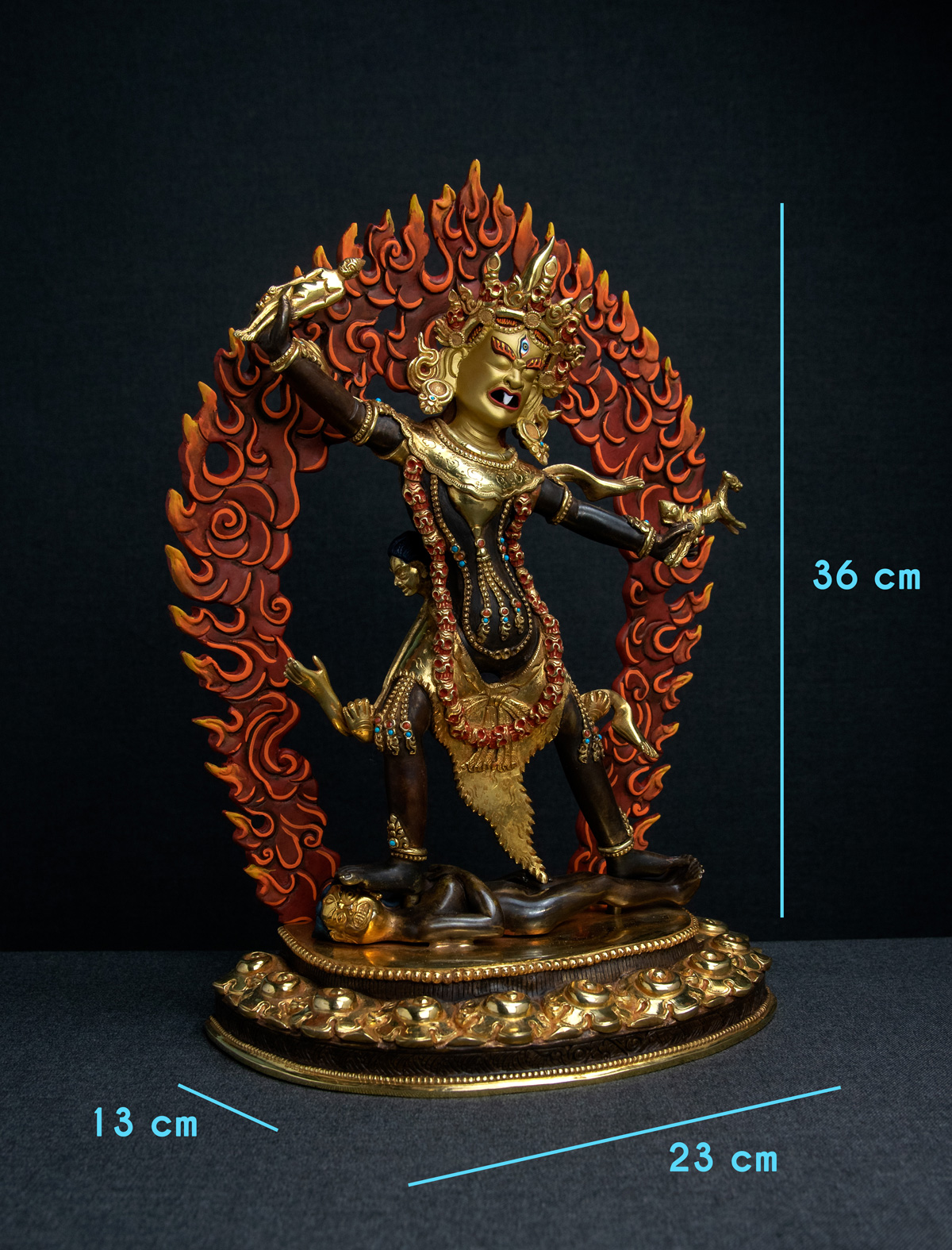 Careful attention to detail is evident in the clean and precise craftsmanship of the statue. Partially gilded in lustrous 24k gold, Ekajati's form is adorned with a blackish finish, mirroring the dark blue color associated with her divine embodiment. The meticulously painted face, enhanced with the radiance of 24k gold, adds a touch of divine beauty to her countenance. As practitioners gaze upon this statue, they are invited to immerse themselves in the profound energy it radiates, forging a powerful connection with Ekajati in their spiritual endeavors.