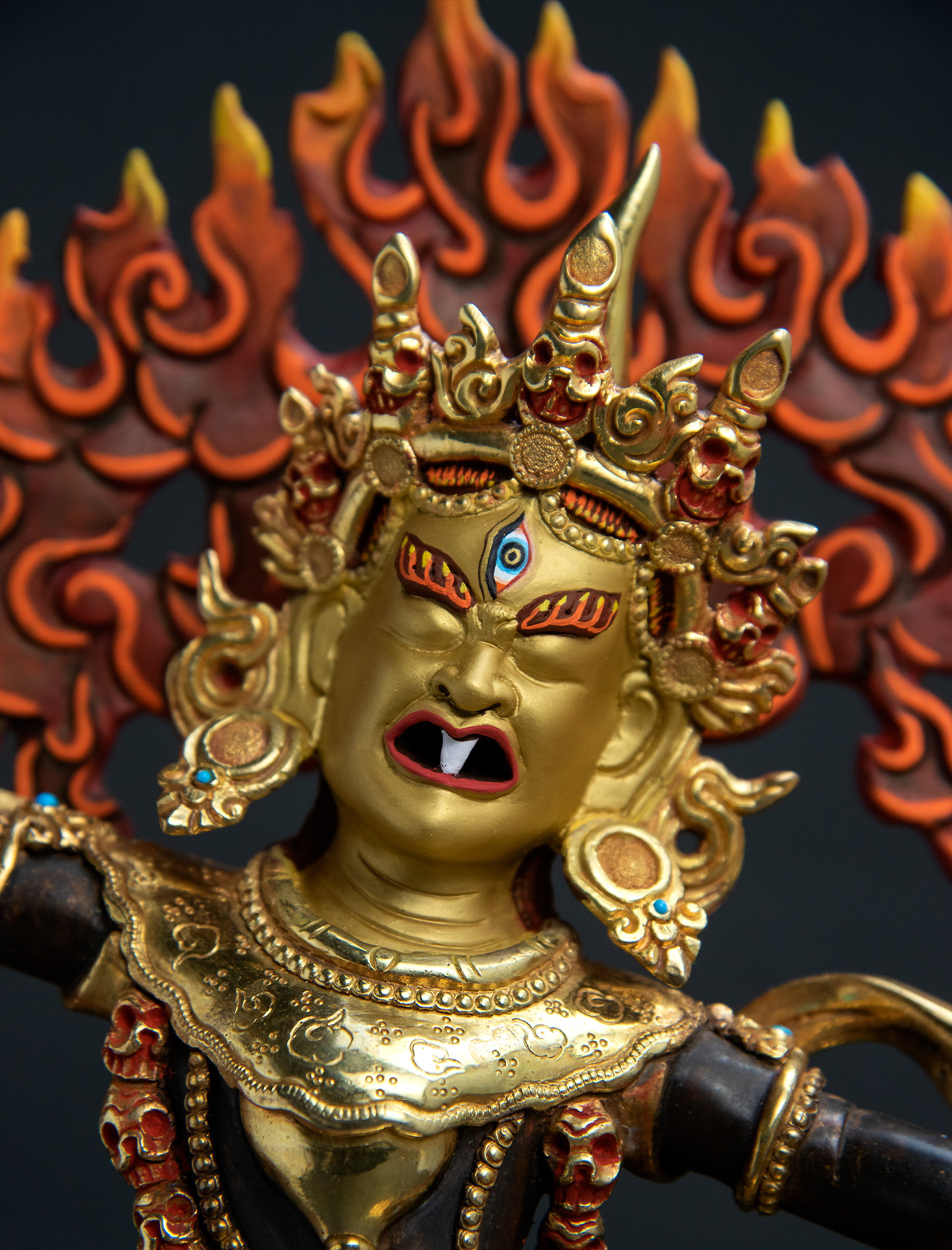 Ekajati, a potent and revered figure within the Vajrayana tradition, assumes the crucial role of a Dharmapali—a fierce guardian of the Dharma. Her significance is particularly emphasized in the Nyingma lineage, where she stands alongside Rahula and Vajra Sadhu as one of the primary protectors. This intricately crafted statue pays homage to Ekajati's formidable presence, capturing the essence of her protective nature and spiritual importance.