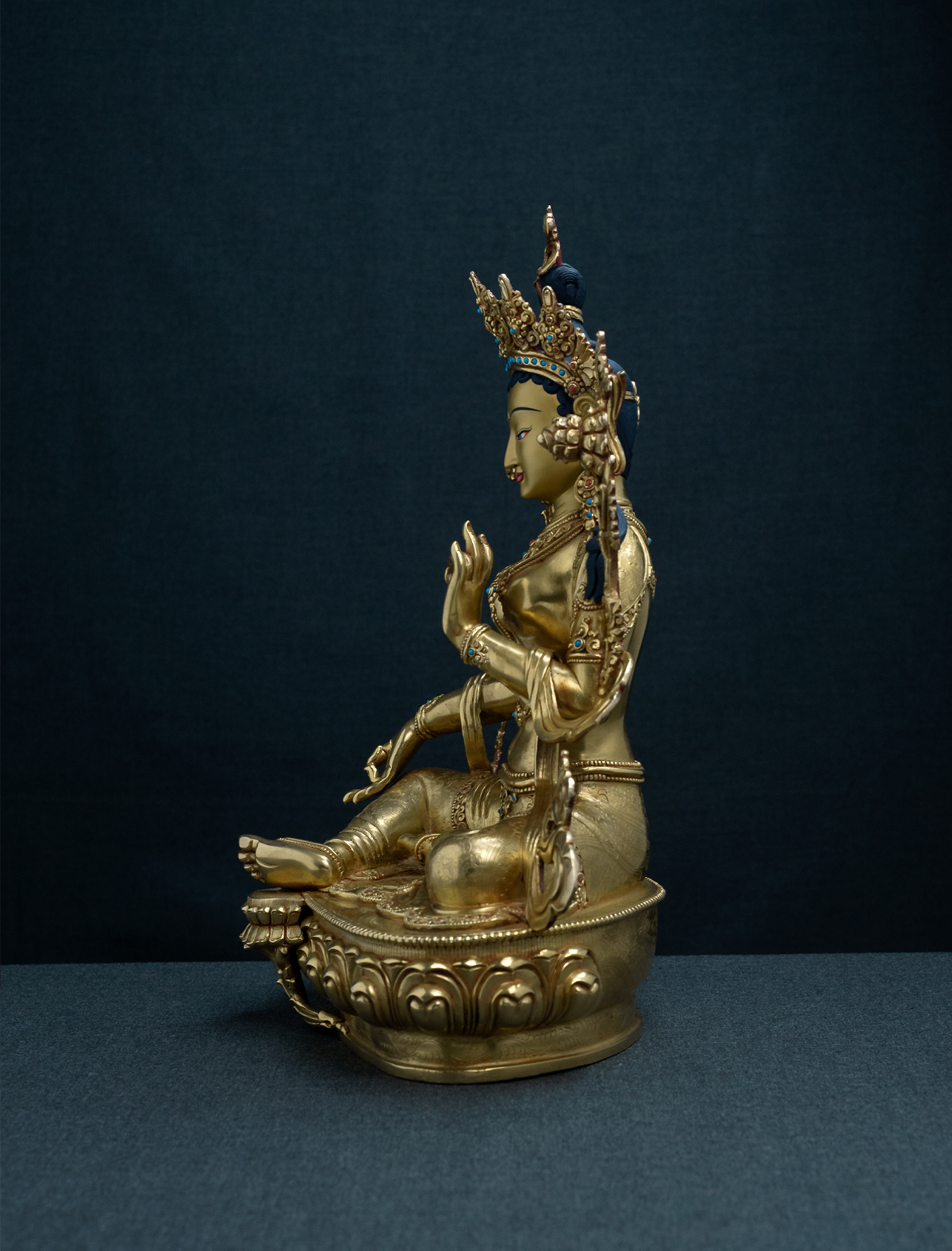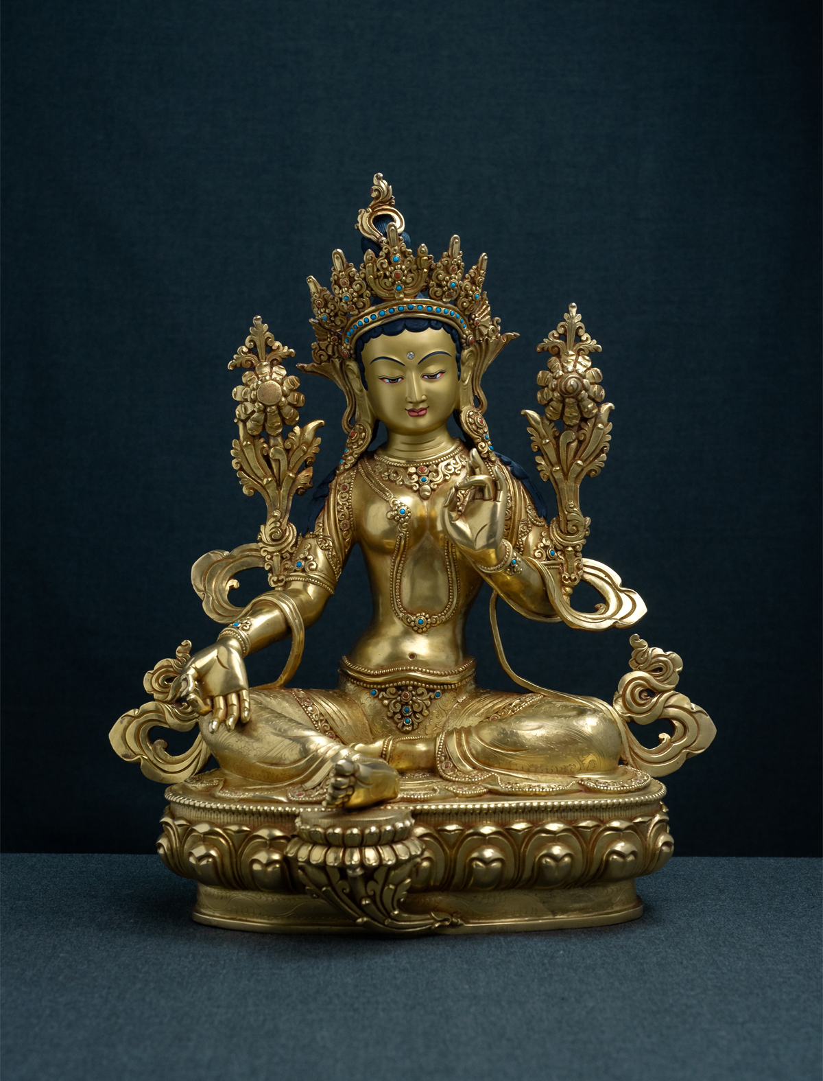 Showing supreme generosity through offering refuge and granting protection, Green Tara is a Bodhisattva embodying great compassion towards all beings. While being aware of her qualities and representing all the activities of the Buddhas, this statue of her has been crafted with patience and diligence. The finely carved engravings have been worked with a vision to produce the highest level of craftsmanship. With 24k mercury gilding, the figure radiates through the room. The calm and gracious face has been worked on with perfection. The fine detailing that you will see while viewing this piece, not only captivates the eyes but also justifies the aura of Green Tara.