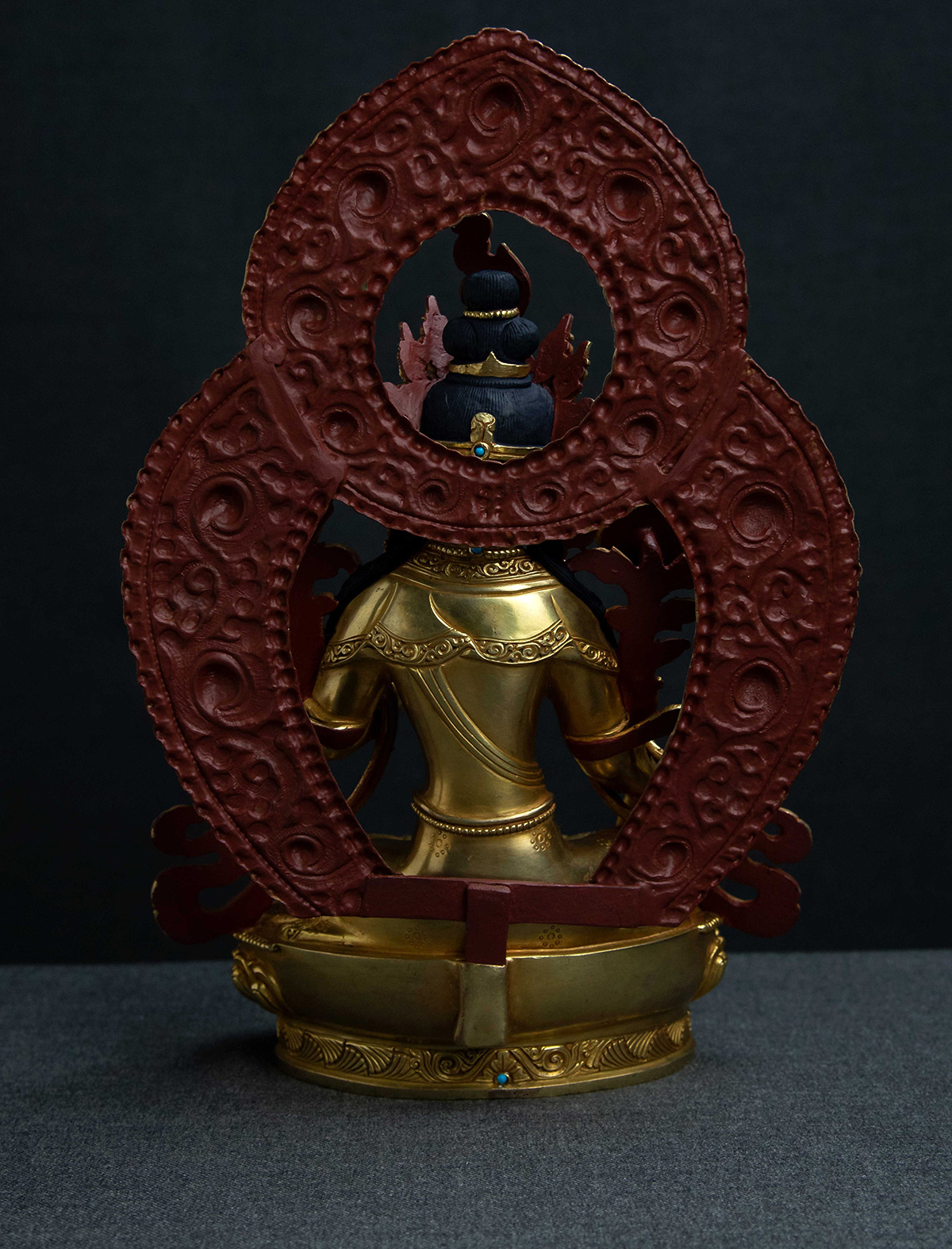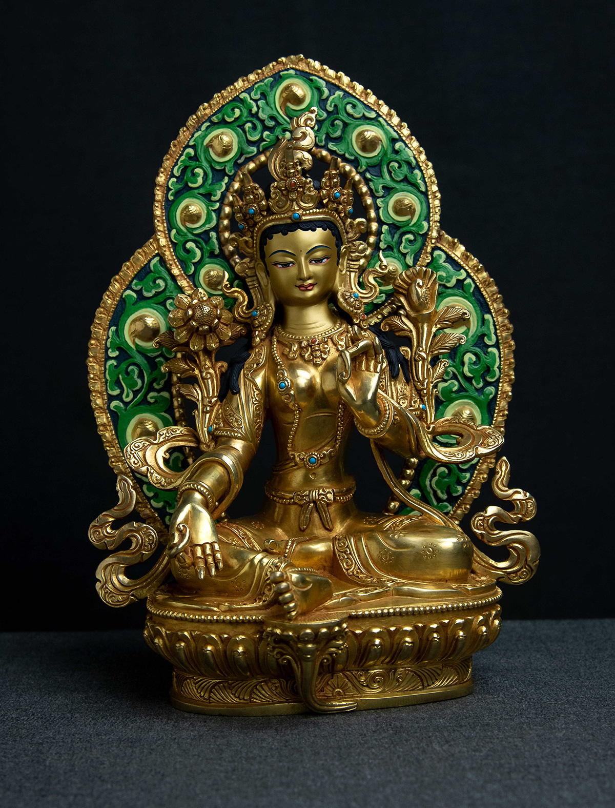 This exquisite statue depicts Green Tara, an embodiment of universal compassion who represents all the activities of Buddha. Her swift nature in coming to aid beings from the ocean of suffering is beautifully captured in the intricate details of her Iconography. The statue has been crafted with the intention of aiding practitioners in their practice, with a beautifully carved and painted Halo adding to its aesthetic appeal. The statue is gilded entirely with 24k gold, and the antique finish adds a sense of calmness and comfort to its overall appearance. The face of the statue has been expertly painted with gold, creating a powerful connection between the practitioner and the statue. The level of craftsmanship and attention to detail on this statue is truly remarkable, making it a treasured addition to any collection.