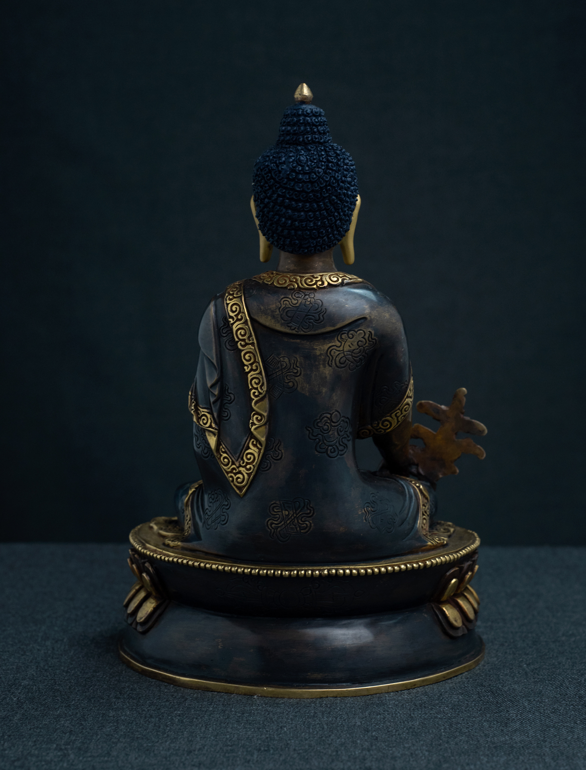 Regarded as the Buddha of Medicine and Healing, this statue of Medicine Buddha is crafted with time and patience, giving perfect and precise detailing. Seated on a double lotus throne, the beautiful engravings on the borders of the robe have been highlighted with 24k part-gold mercury gilding. The elegance is formed in combination with the dark color finish on the robe and the brown color finish on the skin areas. The calm face that soothes the viewers is painted with gold and with great attention to detail that we see in the eyes and the lips.