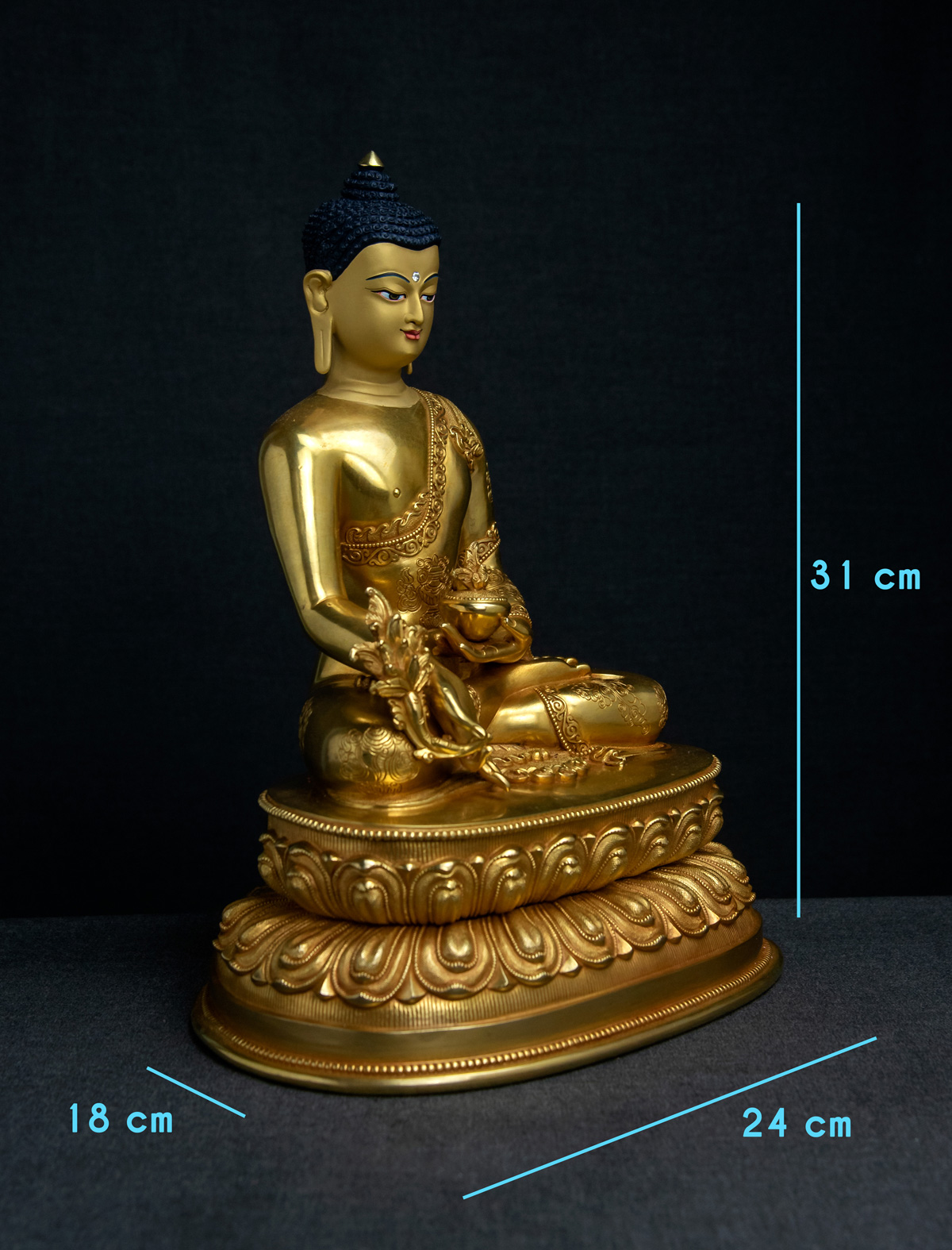 This exquisite statue of Medicine Buddha embodies the essence of simplicity and minimalism, expertly crafted with precision. Medicine Buddha, known for his healing abilities, is represented here in accordance with his traditional iconography. The statue is designed in a Newa-Indian style and casted using a second-generation mold The artisan's dedication is evident in the intricate workmanship that graces every aspect of this masterpiece. Delicate and beautifully swirling engravings adorn the borders of the Buddha's robe, enhancing its elegance. The entire statue is resplendently gilded with 24k gold, radiating a divine aura. The artistry extends to the antique finishing, thoughtfully applied to select areas of exposed skin on the statue, creating a captivating contrast that highlights the robe's brilliance. The statue’s face is a true marvel, skilfully sculpted and painted with gold, resulting in fine lines and exquisite detailing that imbue his face with a serene and radiant presence. This statue serves as a vessel for the profound energy of Medicine Buddha, inviting all who gaze upon it to partake in the practice of awakening.