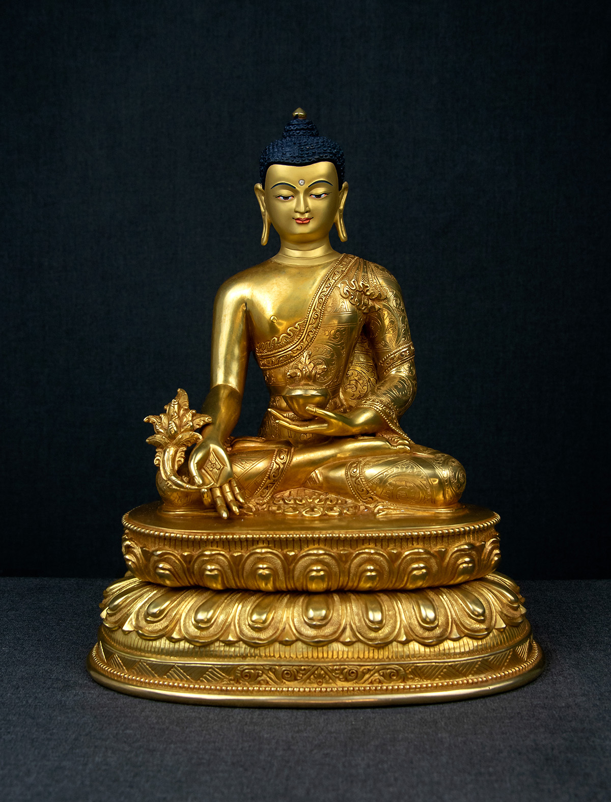 This exquisite statue of Medicine Buddha embodies the essence of simplicity and minimalism, expertly crafted with precision. Medicine Buddha, known for his healing abilities, is represented here in accordance with his traditional iconography. The statue is designed in a Newa-Indian style and casted using a second-generation mold The artisan's dedication is evident in the intricate workmanship that graces every aspect of this masterpiece. Delicate and beautifully swirling engravings adorn the borders of the Buddha's robe, enhancing its elegance. The entire statue is resplendently gilded with 24k gold, radiating a divine aura. The artistry extends to the antique finishing, thoughtfully applied to select areas of exposed skin on the statue, creating a captivating contrast that highlights the robe's brilliance. The statue’s face is a true marvel, skilfully sculpted and painted with gold, resulting in fine lines and exquisite detailing that imbue his face with a serene and radiant presence. This statue serves as a vessel for the profound energy of Medicine Buddha, inviting all who gaze upon it to partake in the practice of awakening.