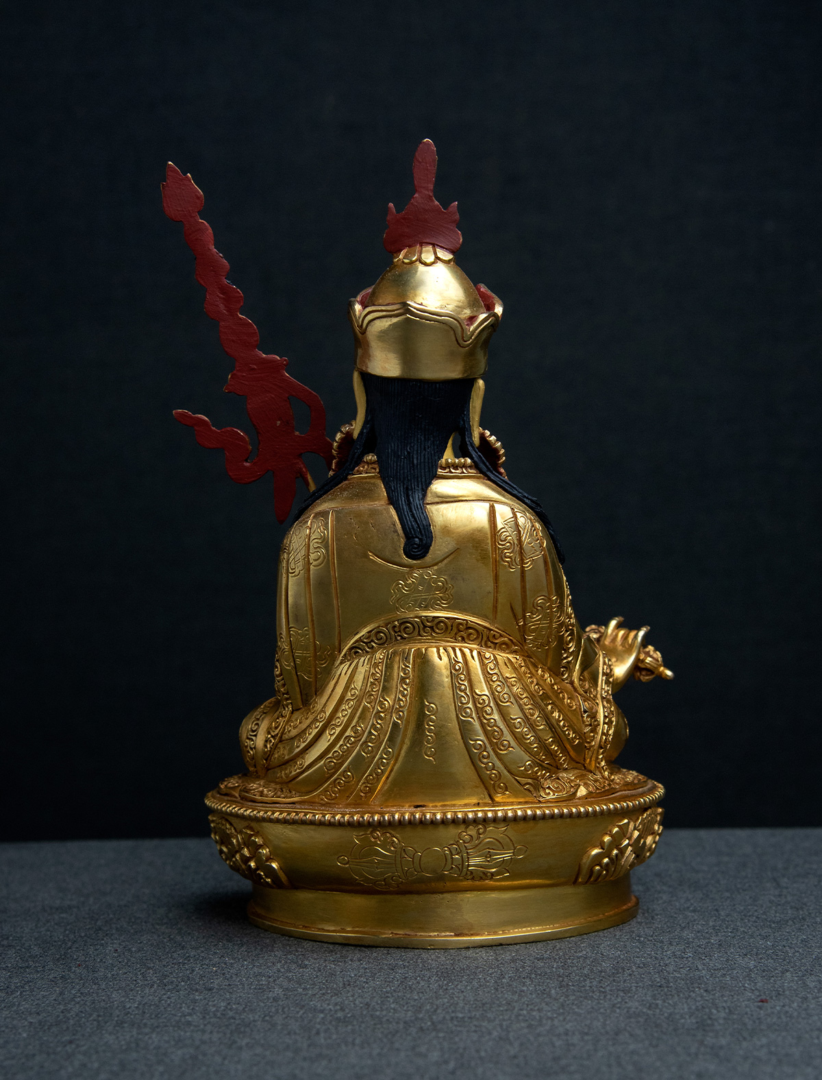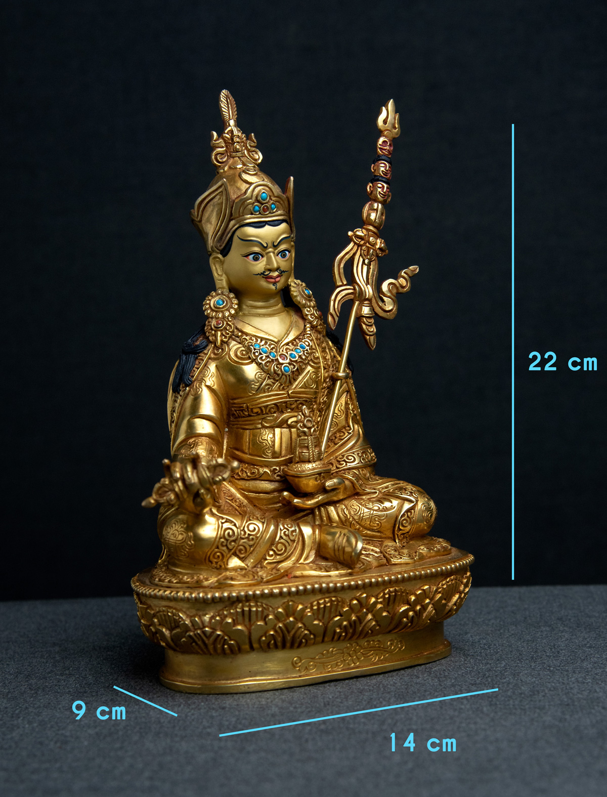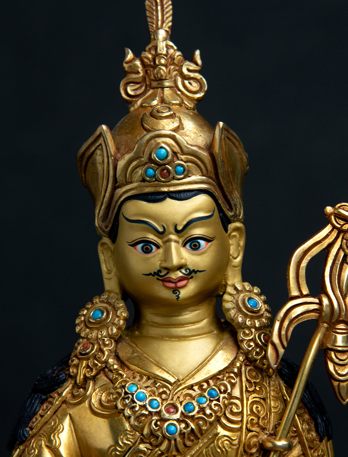 To enhance its magnificence, the statue has been entirely mercury gilded with 24k gold, resulting in a resplendent and majestic presence. The antique finishing further adds an element of elegance and tranquility, creating a sense of calmness for those who gaze upon this masterpiece. The face of Guru Rinpoche has been skillfully painted with gold, accompanied by astonishing detailing that brings forth a radiant glow, enlightening the viewers and inviting a deeper connection with the profound teachings associated with Guru Rinpoche.