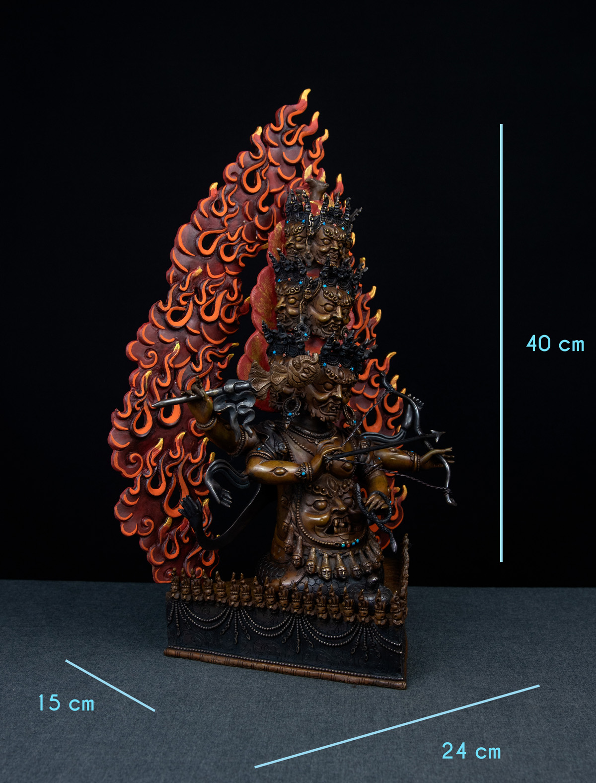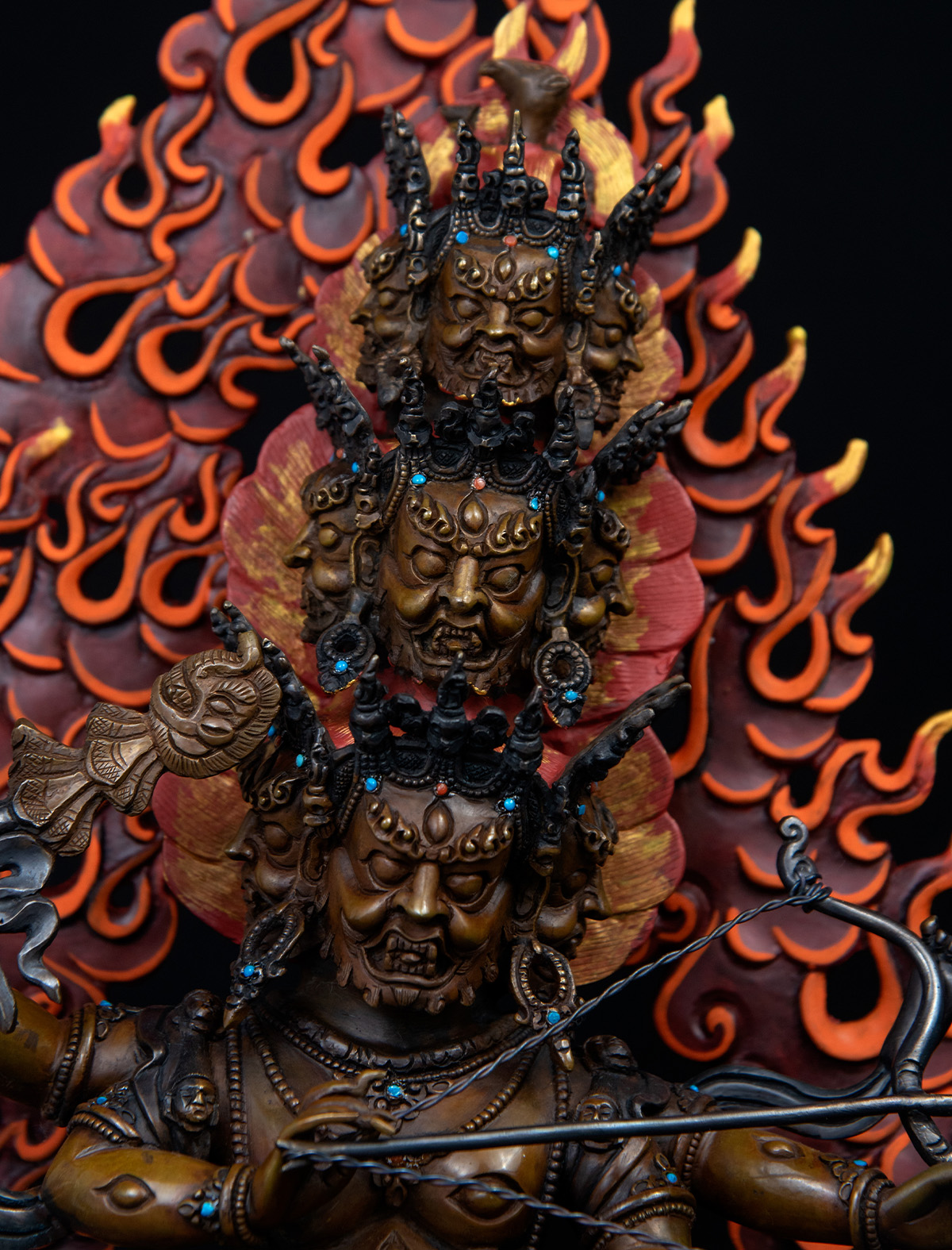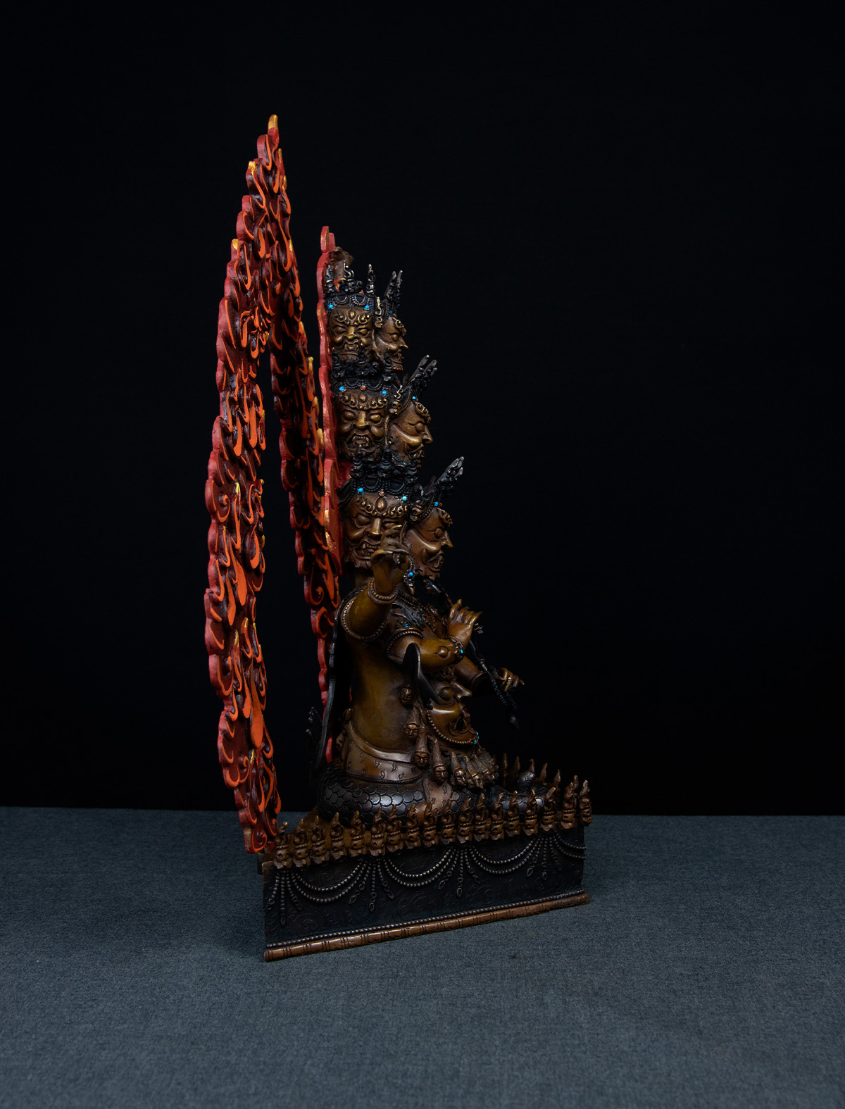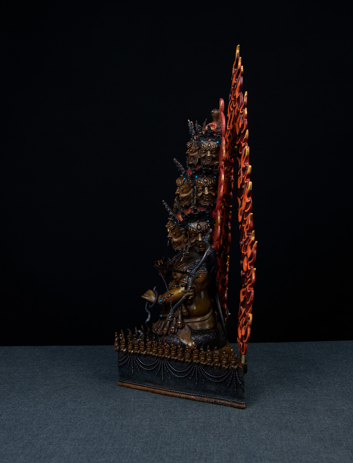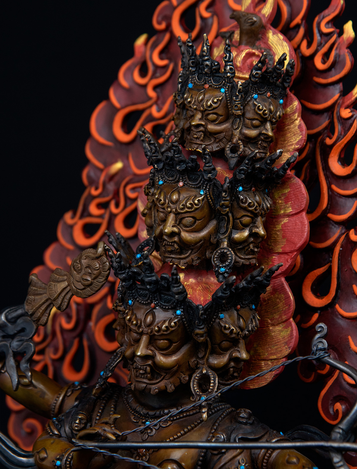 Rahula is portrayed in his characteristic form with nine ferocious heads stacked above one another, symbolizing his all-seeing vigilance across the nine planes of existence. His central face bears an intense, wide-eyed expression — the embodiment of awakened wrath that eradicates ignorance and harmful influences. His body, adorned with ornaments of serpents and a crown of skulls, conveys the raw force of enlightened protection.