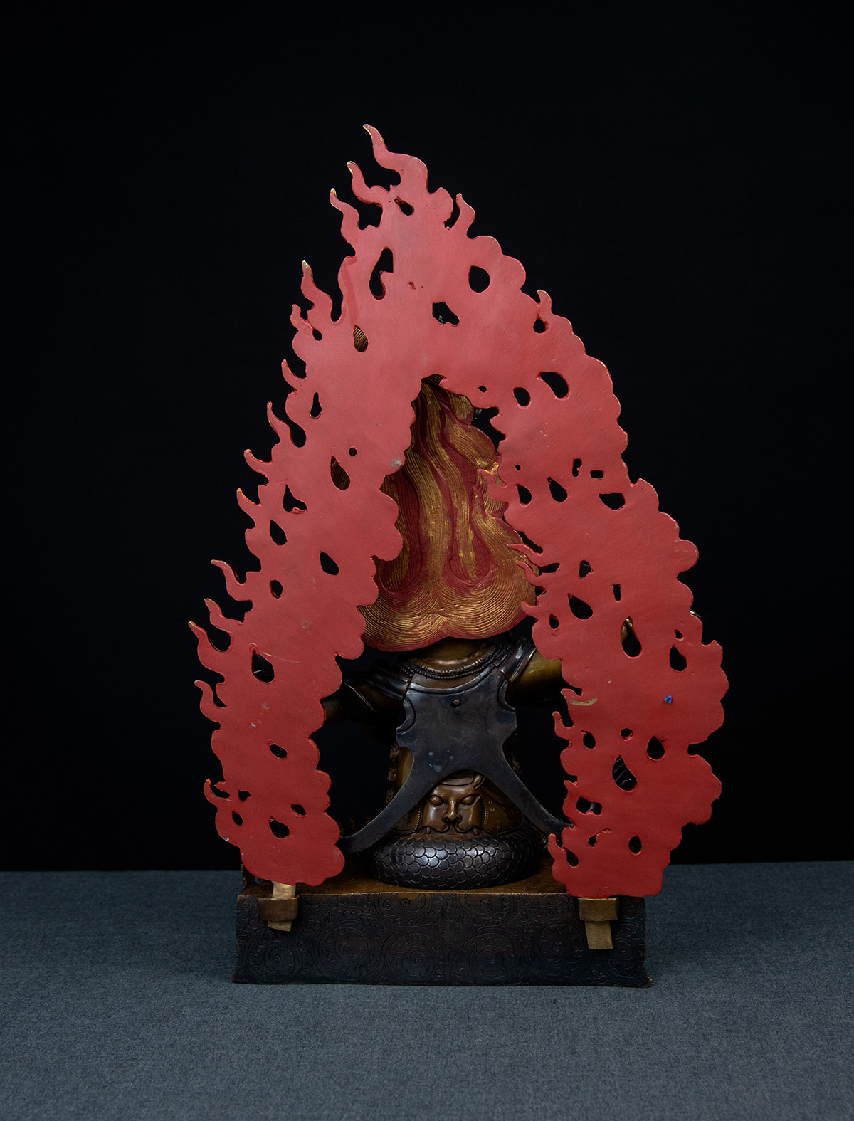 This statue of Rahula, the wrathful protector of the celestial and tantric realms, is skillfully cast in copper alloy and finished in an antique two-toned patina. The dual finish — darker base tones contrasted with soft golden highlights — accentuates the complex layering of his form and the intricate textures that define this powerful deity.