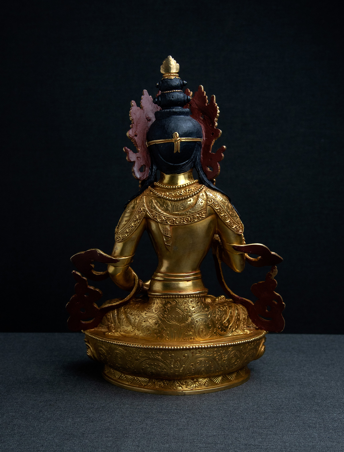 Vajrasattva, a revered bodhisattva and also regarded to be a primordial Buddha, embodies the innate purity of the mind and serves as a symbol of primordial purity. This exquisite statue of Vajrasattva has been meticulously crafted to emanate the luminosity of his inherent purity. The attention to detail in the engravings is remarkable, capturing the essence of his divine presence with clarity and vibrancy. The entire statue has been meticulously gilded with 24K gold, accentuating the elegance of its intricate features. Delicate swirling engravings adorn his robe, enhancing its visual allure. An antique finishing has also been applied, adding a touch of time-worn beauty and a sense of venerable wisdom to the statue. The face, painted in gold with utmost precision and smoothness, exudes a tranquil expression that radiates serenely towards all who behold it.