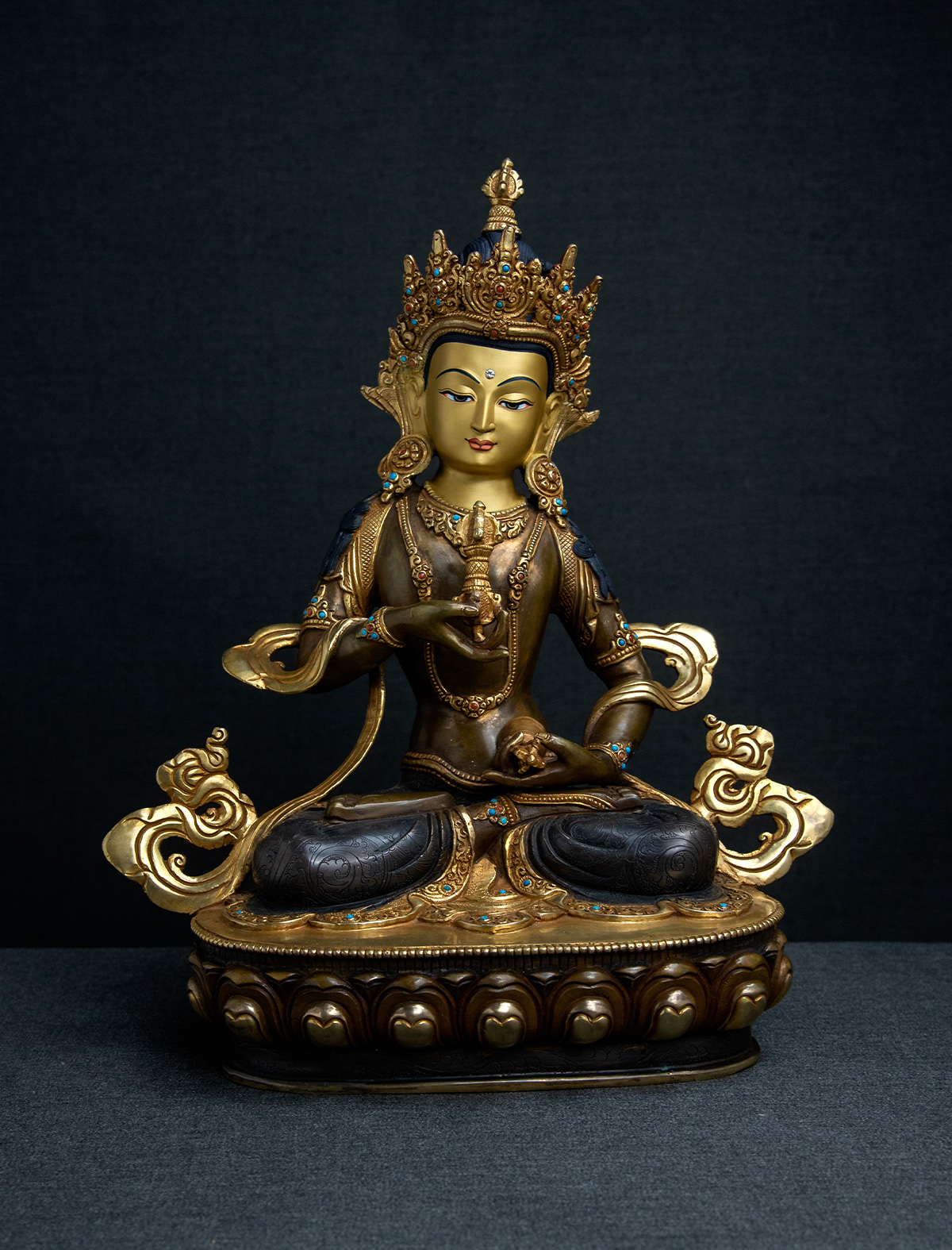 Vajrasattva, the embodiment of innate purity and symbol of primordial wisdom, is a revered bodhisattva in the Buddhist tradition. This exquisite statue of Vajrasattva has been crafted with unparalleled skill and craftsmanship, brilliantly capturing the radiance and essence of his pure being. The exquisite details of the engravings are crisp and clear. The statue is partly fire-plated with 24K gold, lending it an air of timeless elegance that perfectly complements the intricate details that adorn the borders of the robe. The warm, brownish hue of the bare skin area and the dark black color of the robe form a stunning contrast that is pleasing to the eye and highlights the aesthetic beauty of the statue. And the face of the statue, painted with gold with exceptional skill and precision, exudes a sense of peacefulness and tranquillity that is sure to bring a sense of calm and serenity to any space.