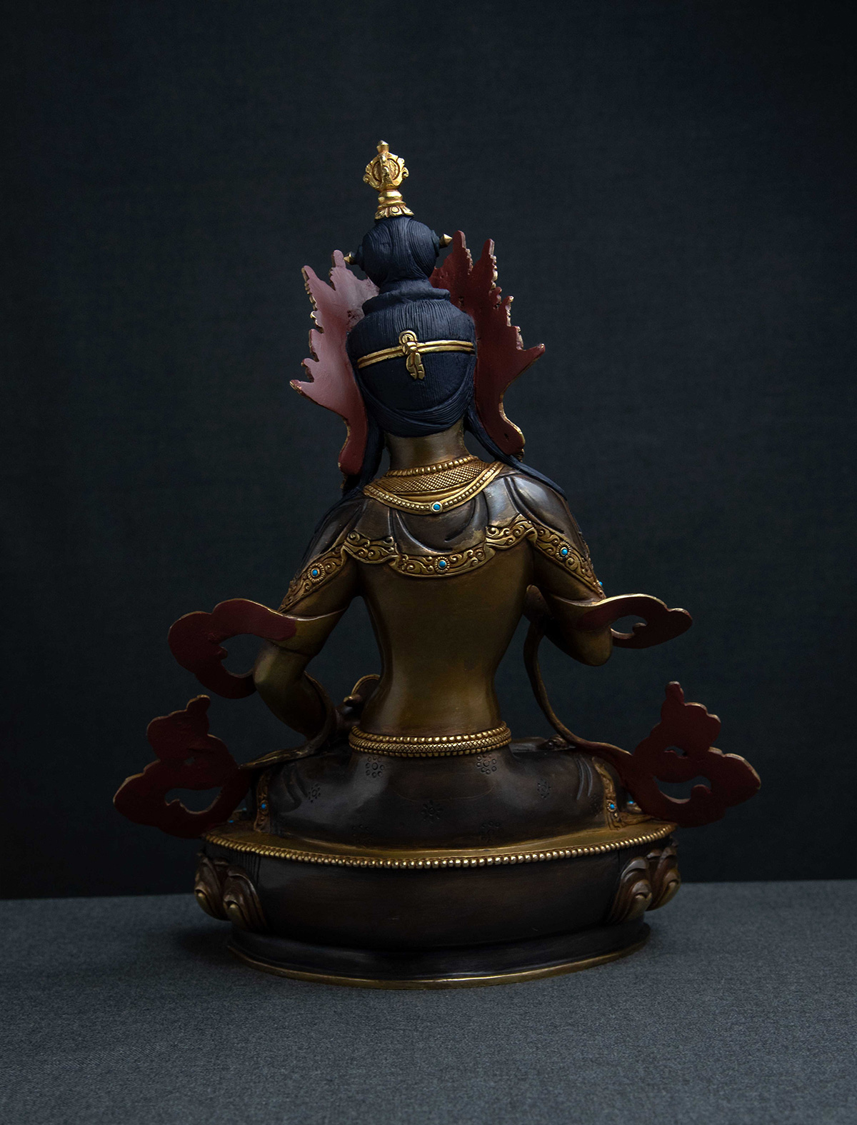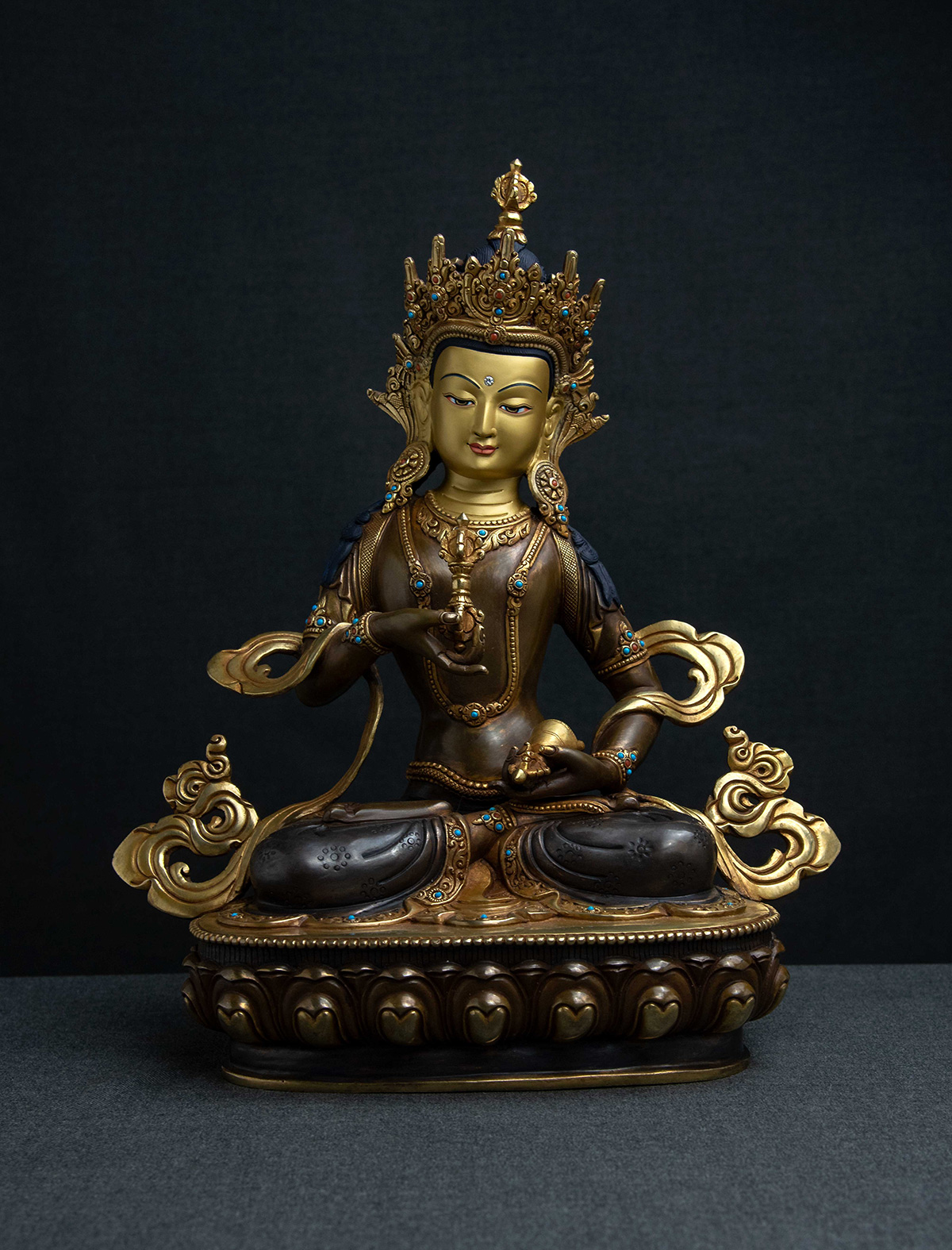 Vajrasattva, the embodiment of innate purity and symbol of primordial wisdom, is a revered bodhisattva in the Buddhist tradition. This exquisite statue of him stands as a testament to the unparalleled skill and craftsmanship of the talented artisans with whom we collaborate, brilliantly capturing the radiance and essence of his pure being. The exquisite details of the engravings are crisp and clear, capturing the essence of Vajrasattva's divine energy and imbuing the statue with a sense of spiritual vitality. The statue is partly fire-plated with 24K gold, lending it an air of timeless elegance that perfectly complements the intricate details that adorn the borders of the robe. The warm, brownish hue of the bare skin area and the dark black color of the robe form a stunning contrast that is pleasing to the eye and highlights the aesthetic beauty of the statue. And the face of the statue, painted with gold with exceptional skill and precision, exudes a sense of peacefulness and tranquility that is sure to bring a sense of calm and serenity to any space. While this statue may not be a masterwork, it is undoubtedly one of the finest examples of statue craftsmanship, a true testament to the beauty and power of Buddhist art.