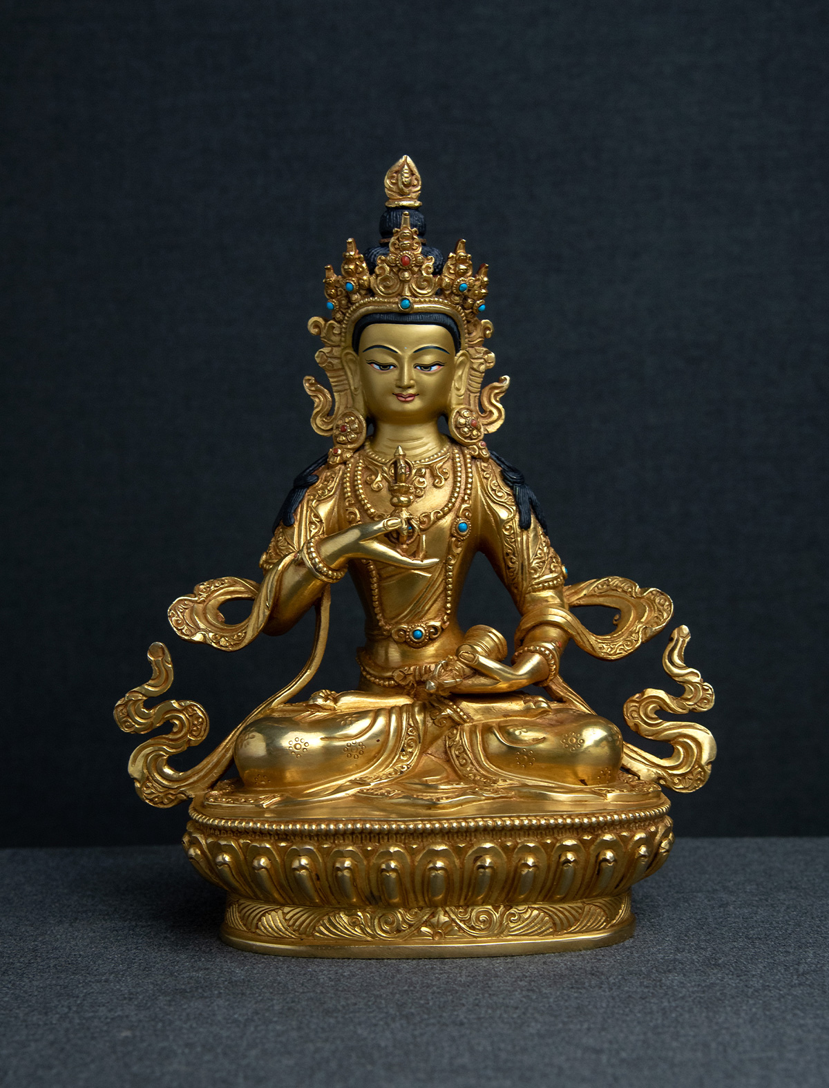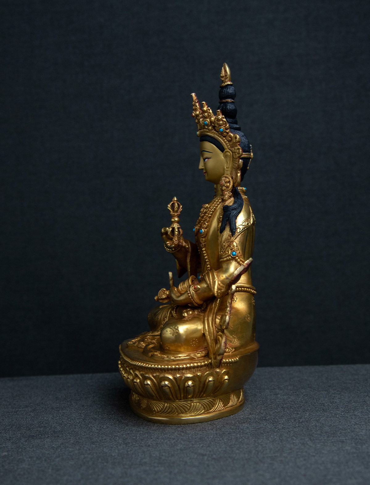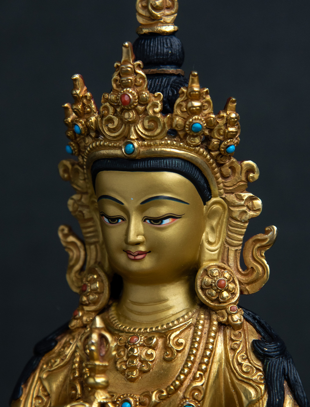 Vajrasattva is a powerful symbol of primordial purity, representing the innate purity of the mind. Expertly crafted with meticulous attention to detail, this stunning statue captures the essence of Vajrasattva. The exquisite engravings on the borders of Vajrasattva's robe are a striking showcase of the exceptional craftsmanship employed in creating this statue. The statue has been gilded with 24k gold, which lends a lustrous shine and regal beauty to its form. An antique finish adds depth and character, imbuing the statue with a sense of timelessness. The face of Vajrasattva is masterfully crafted, and the use of gold in its painting creates a mystical aura that resonates with practitioners. This statue is a sublime work of art that inspires devotion and reverence, inviting practitioners to tap into the purity of the mind and embark on the path of spiritual awakening.