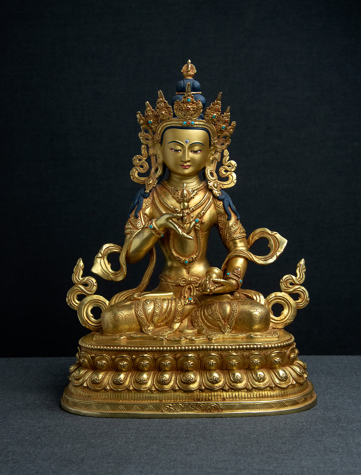 The robe of the statue is adorned with intricate engravings, skillfully etched along the borders and flowing seamlessly throughout the fabric. These delicate patterns, along with the application of 24k gold gilding, contribute to the radiance and opulence of the statue. Additionally the gilding has been enhanced with an antique finishing. This meticulous touch further adds to the allure and richness of the piece, creating a sense of timeless beauty and reverence. The serene face of Vajrasattva, expertly painted to capture a sense of calmness and inner peace, completes the embodiment of this revered bodhisattva. Through the combination of these elements, the statue emanates a powerful energy and aura, inviting practitioners and viewers to engage in a meaningful and transformative experience.