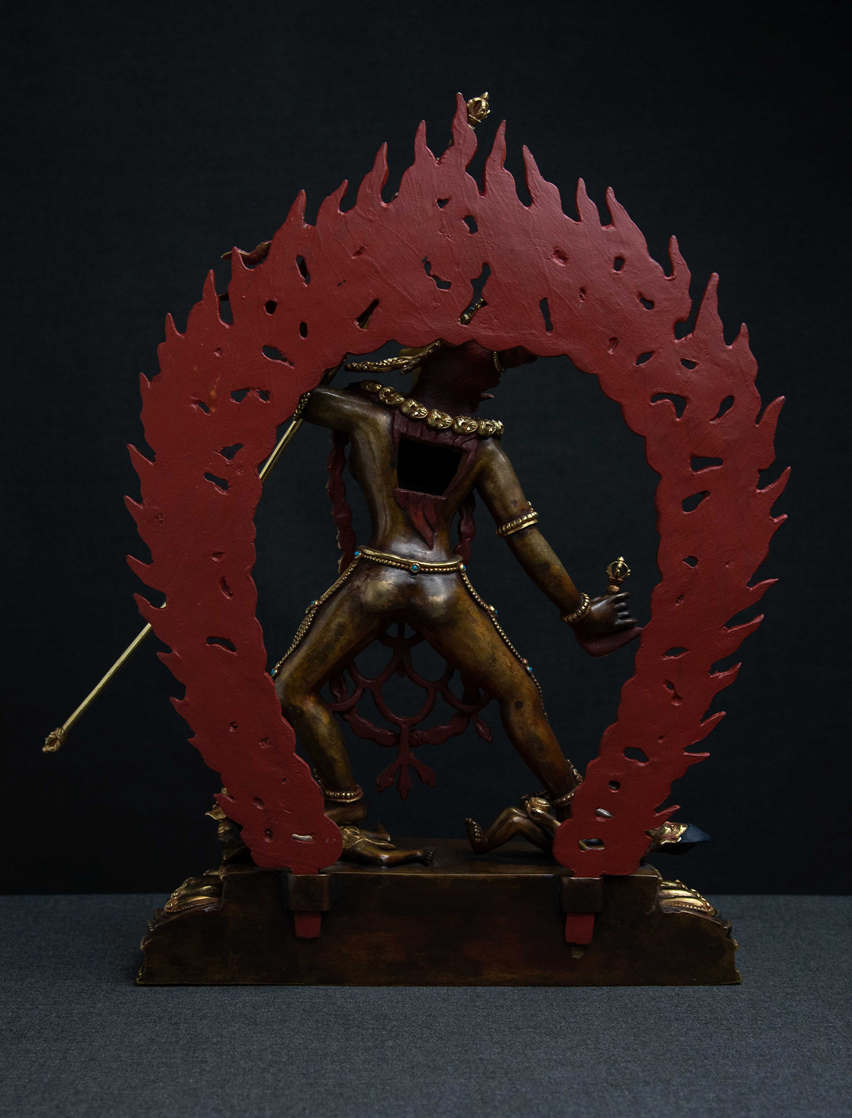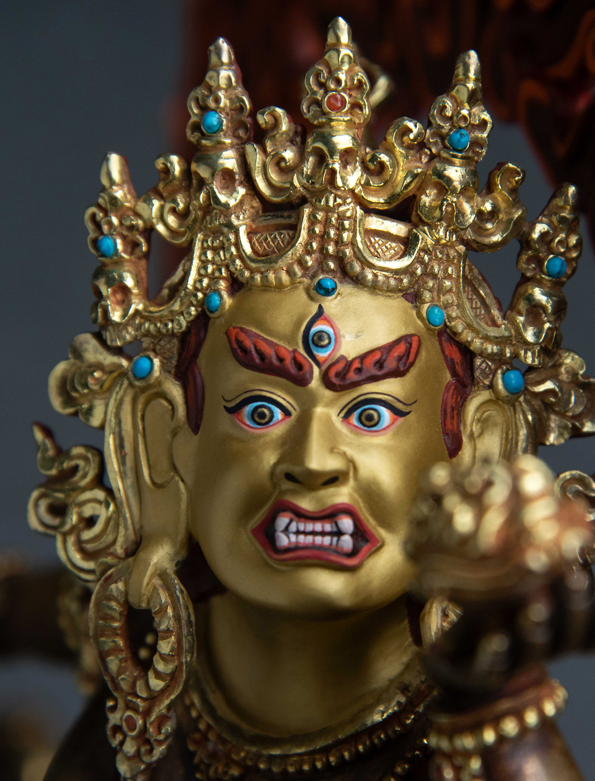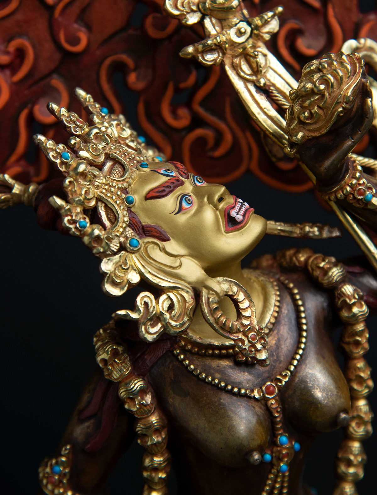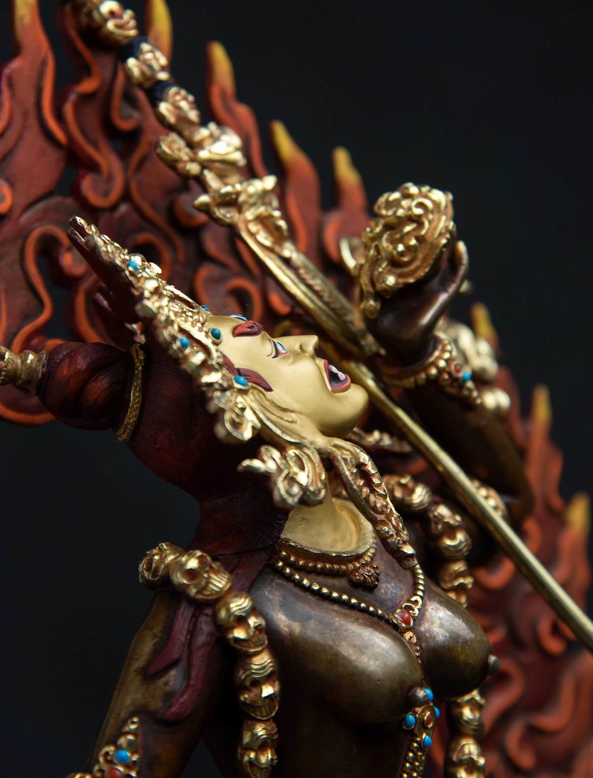 Vajra Yogini is a powerful Dakini who embodies the transformative energy of the enlightened feminine. This exquisite statue of her has been crafted with a deep understanding of her nature and iconography to benefit practitioners in their spiritual practice. The reddish hue of her body color, along with the 24k gold mercury gilding and intricate flame details, captures the attention of the viewer and evokes a sense of her fierce and radiant presence.