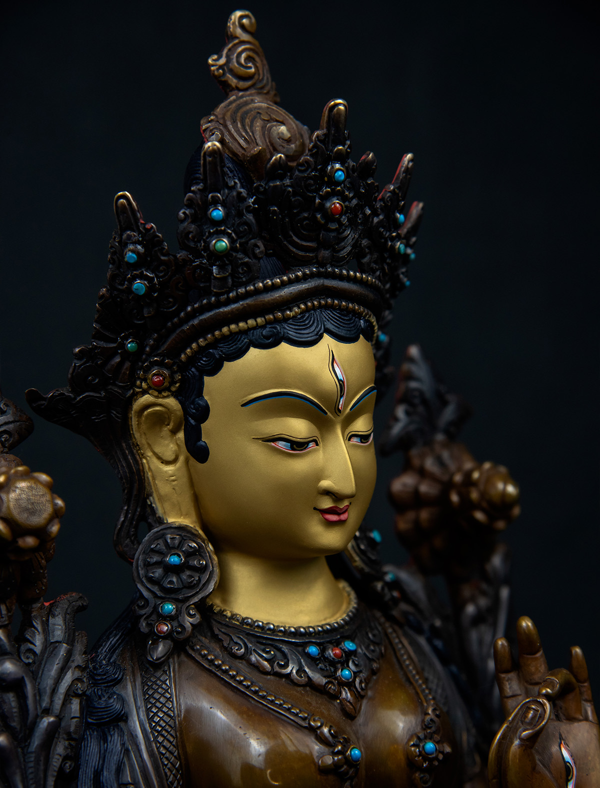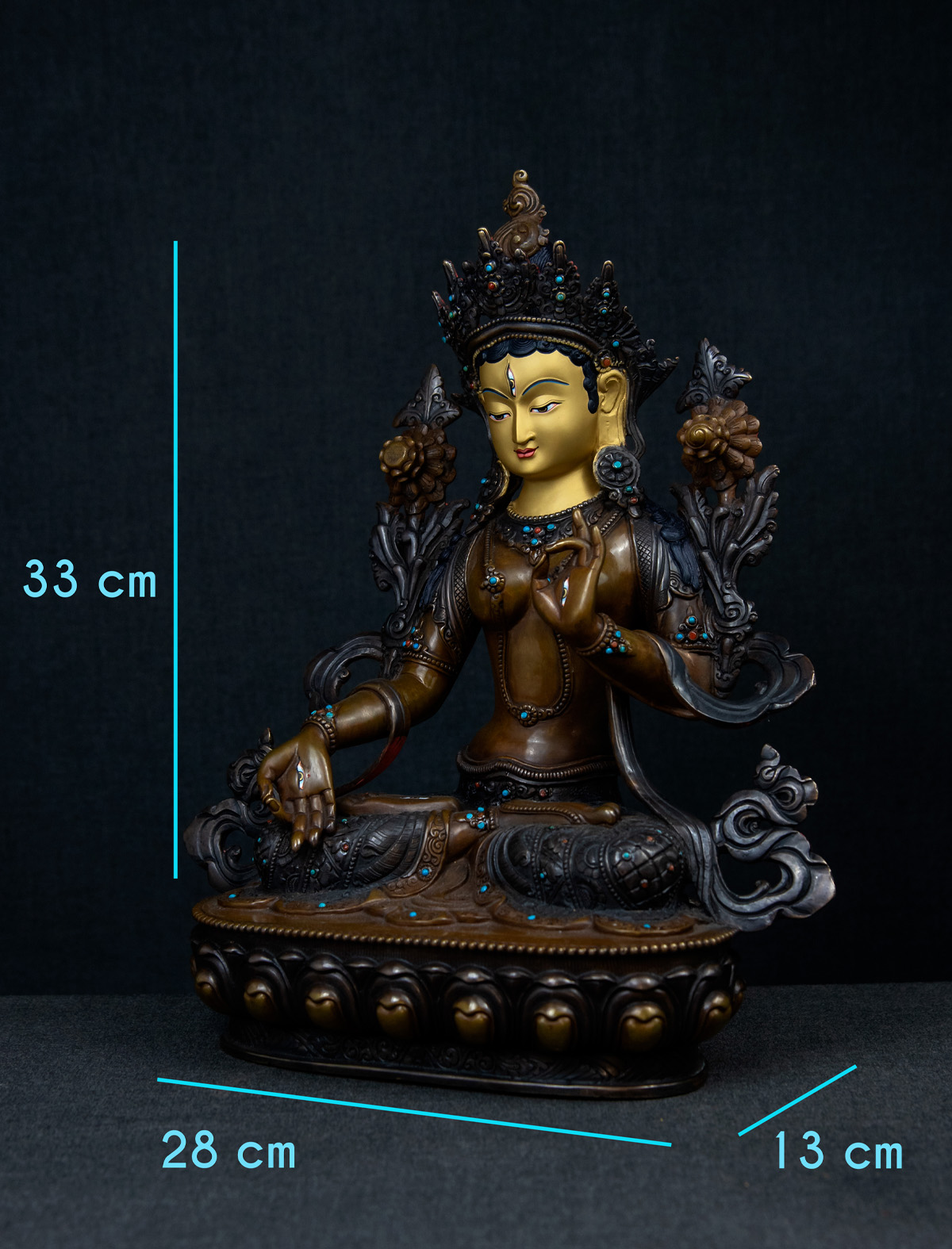 Adorned with blue and red turquoise stones on her crown and jewelry, the statue radiates a serene and graceful presence. Her calm and gentle face has been beautifully sculpted and delicately painted with 24k gold, showcasing fine artistry. This exquisite work allows practitioners and viewers to connect with White Tara’s essence, enriching their practice with a sense of peace and devotion.