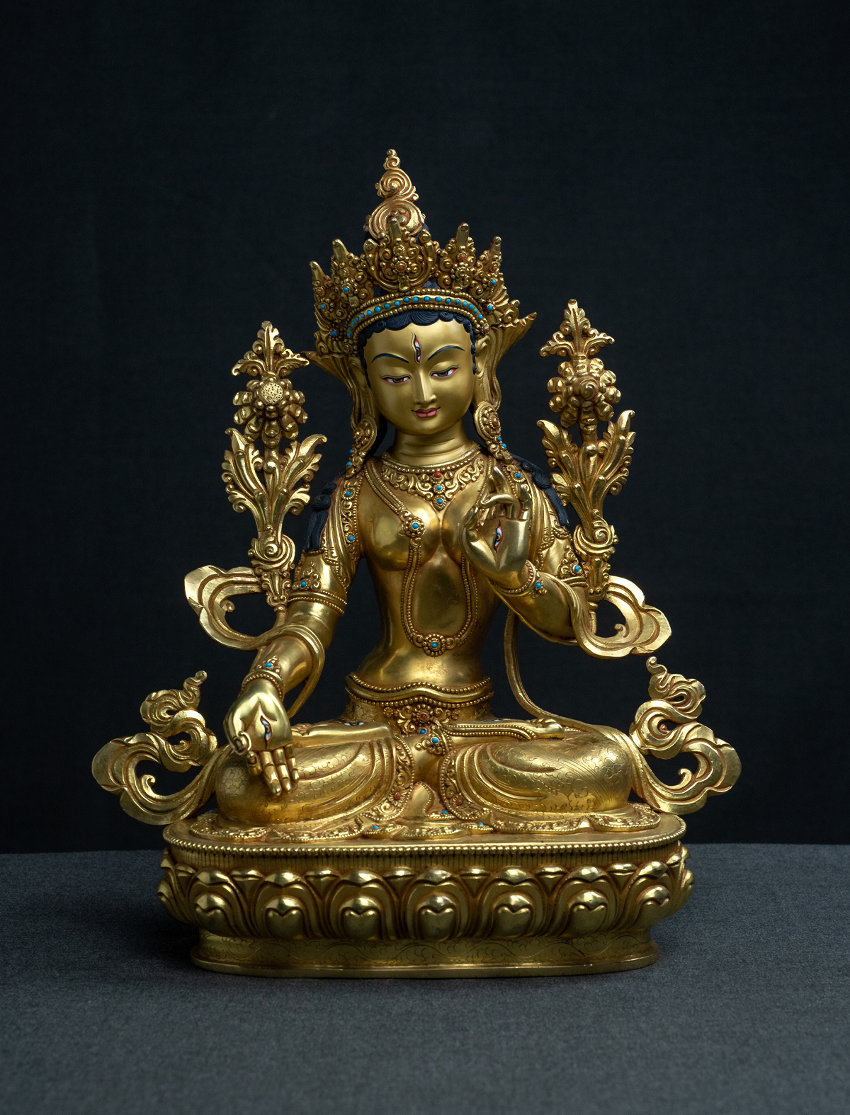 White Tara is a Bodhisattva associated with healing and protection of our mind and body. Understanding this energy that she embodies, this statue of her has been crafted excellently with fine detailing. The detailing that we see on the edges of her robes has been engraved deeply to give us high visibility. Light engravings have also been added to her robes. 24k gold has been gilded entirely to the statue. With blue and red turquoise stones added to her crown and pieces of jewelry, this statue certainly radiates her aura throughout the room. Her calm and gracious face has been carved beautifully and 24k gold painted with fine artistry. This allows practitioners and viewers to form a subtle connection that brings up a meaningful practice.