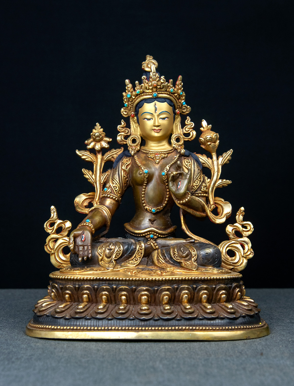 This 9-inch White Tara statue is crafted in copper, partly gilded with 24k gold, and finished in a two-toned antique style that blends deep black with soft brownish tones. The gentle contrast between the gold and darker shades brings clarity to her form and draws the eye to the intricate details of her adornments and robes.